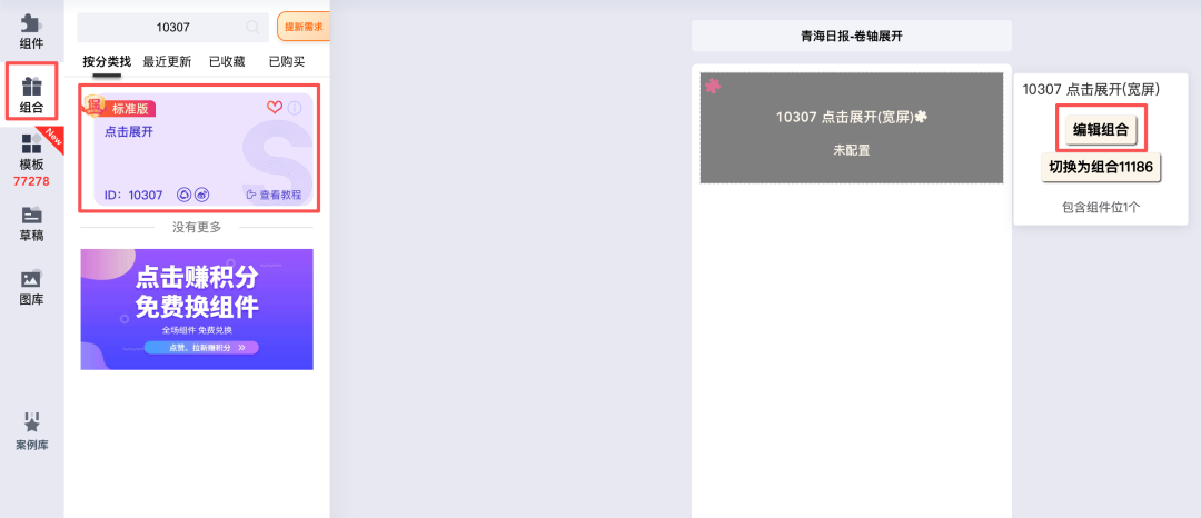 ①登录i排版SVG编辑器后,点击编辑器左侧「组合」按钮,在「花样展开」分类中找到「点击展开」组合,或者在组合中直接搜索编号10307,点击选择。