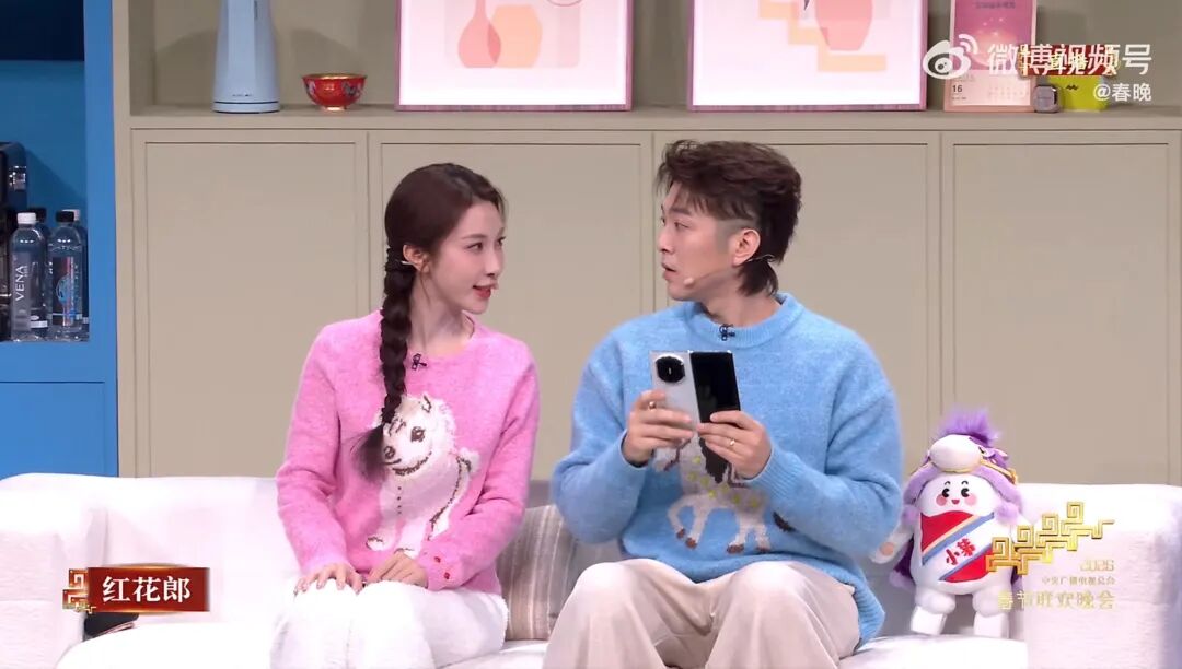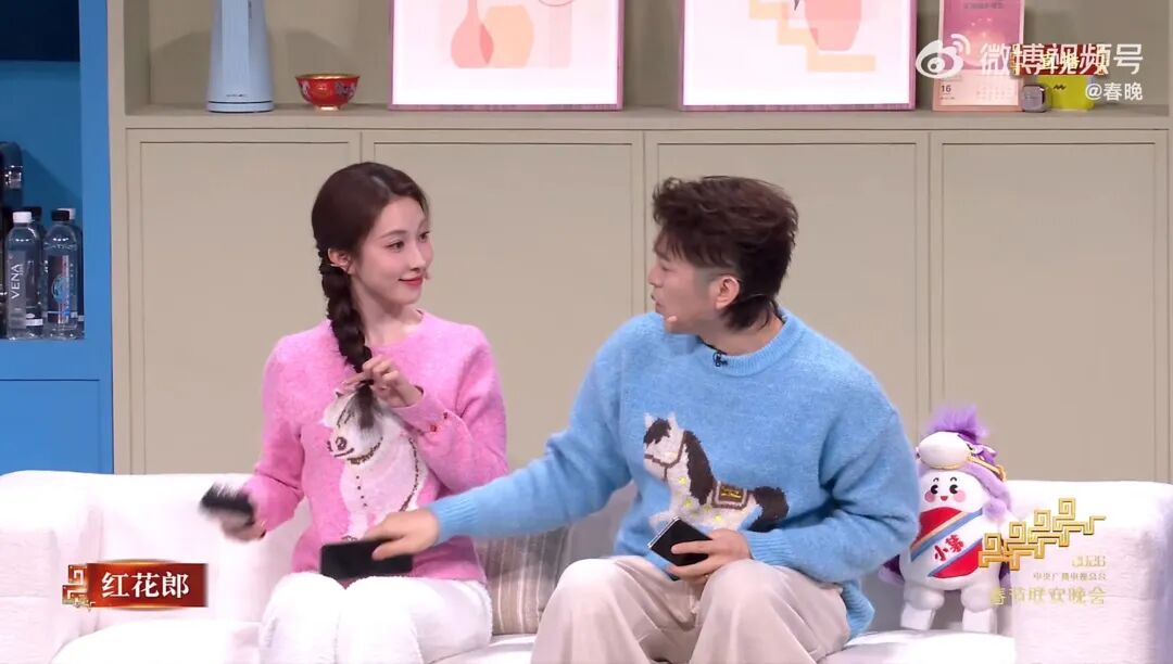 张小婉和周铁男在喜剧短剧《你准喜欢》中的情侣马年毛衣,搭配宽松舒适的白色阔腿裤,温馨又喜庆。粉色与浅蓝色的温柔碰撞,简约中显品味。
