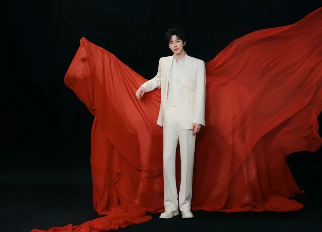 李昀锐身着红金配色新中式西服,宛如画卷中走出的俊逸贵公子,贵气与少年感并存。