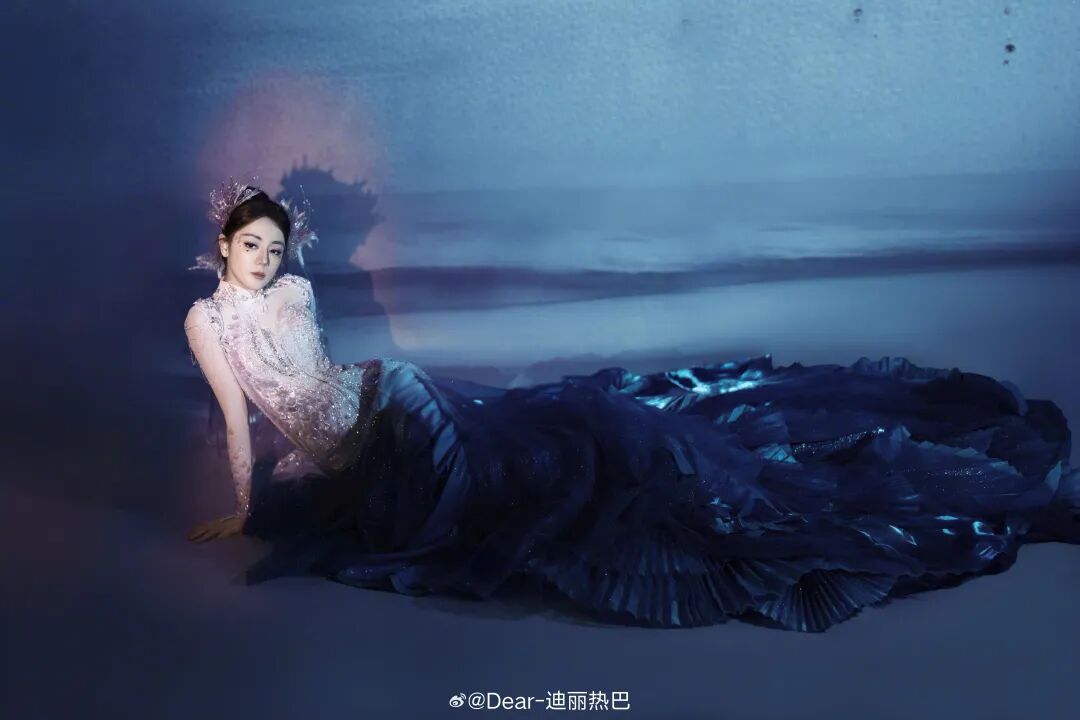 迪丽热巴在四川宜宾分会场的“美人鱼”造型,堪称视觉焦点。这套蓝色修身礼服,上半身如鱼鳞般流光溢彩,下半身则是散开的垂坠裙摆,当她舞动起来,真的宛如一条从深海中浮现的人鱼公主。在《立上游》的舞蹈中,这套礼服不仅是装扮,更是故事的一部分——身姿如流光跃动,美丽得让人屏息。