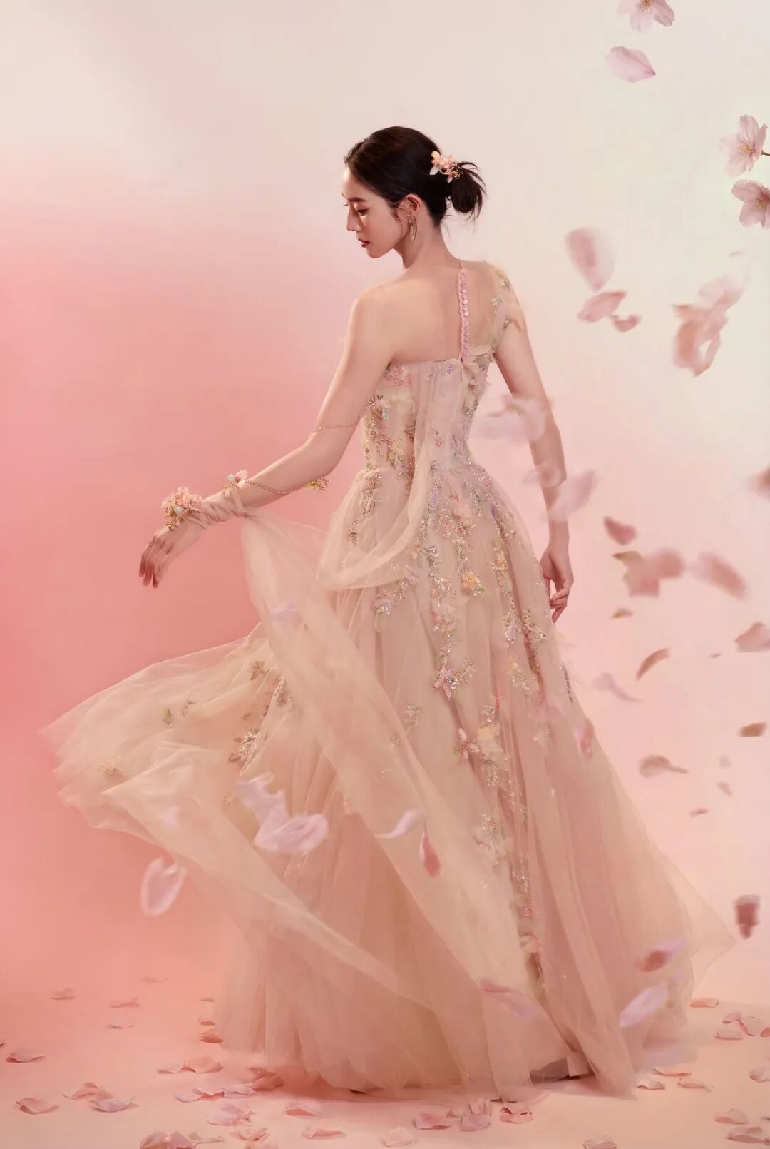 张钧甯的淡粉色纱裙,则演绎了另一种仙气。层层叠叠的薄纱如云似雾,将她衬托成一朵盛放的绒花。轻盈、梦幻、不食人间烟火——这正是仙子该有的样子。
