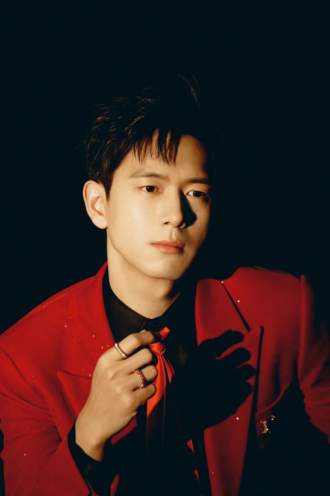 丁禹兮的红色哑光丝绒质感的新中式外套,领口盘扣锁住东方风骨,搭配垂坠的西装裤和简约白色内搭,传统与现代的碰撞中,少年意气与节日氛围一同拉满。