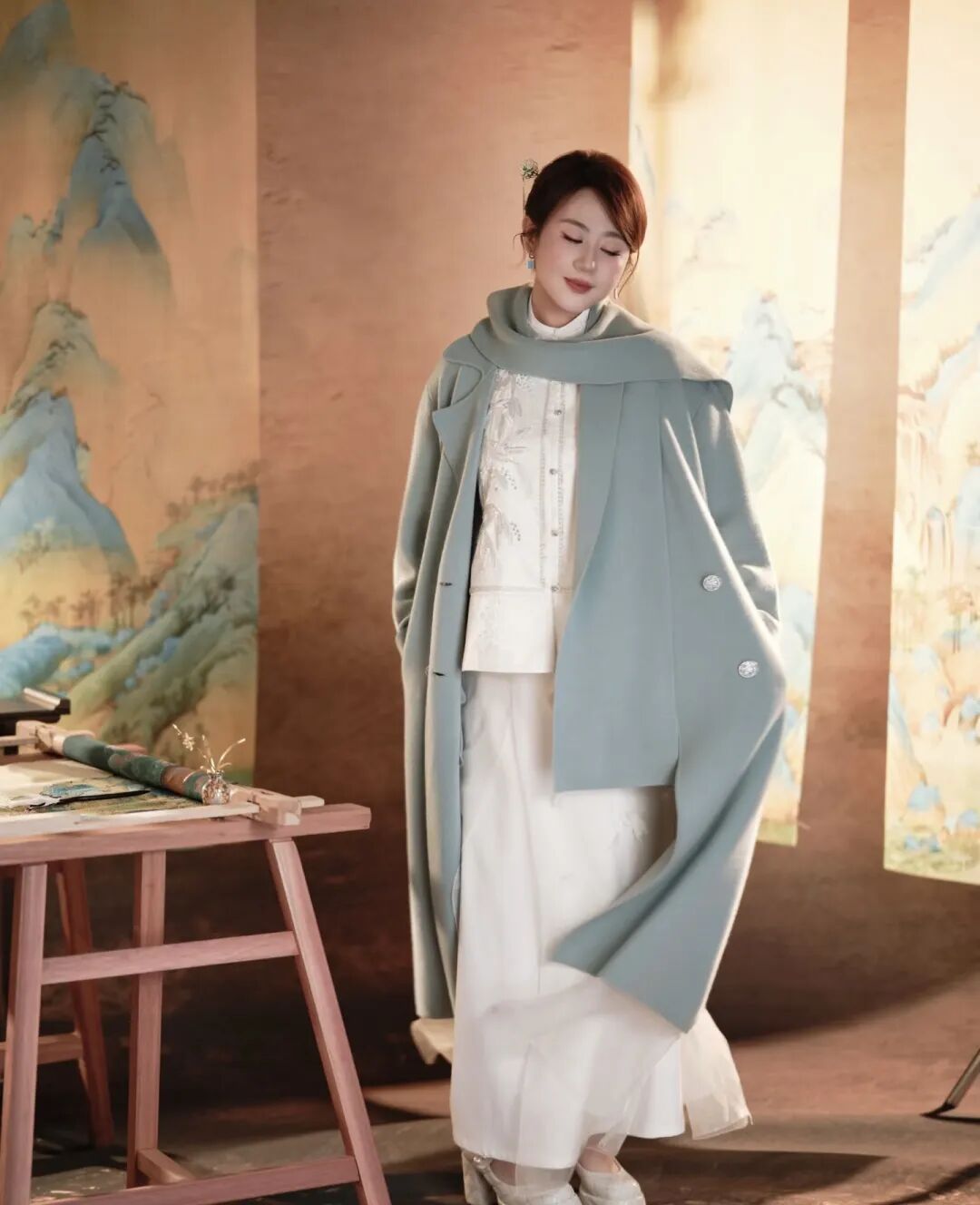 马丽在贺岁微电影《我最难忘的今宵》中的造型,则为职场女性提供了完美参考。内搭的白色新中式简约大气,外搭的绿色大衣则凭借独特的剪裁和垂坠的线条,让整体造型立刻有了高级感。绿色的选择更是点睛之笔——既有春意,又不易撞衫,绝对是日常穿搭的出挑之选。