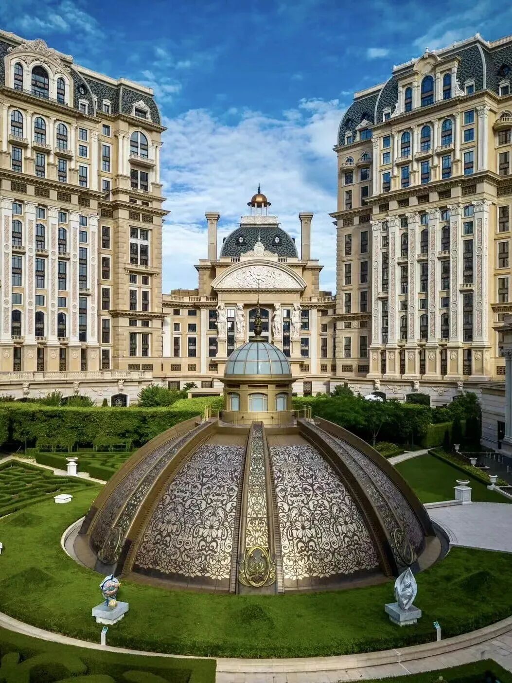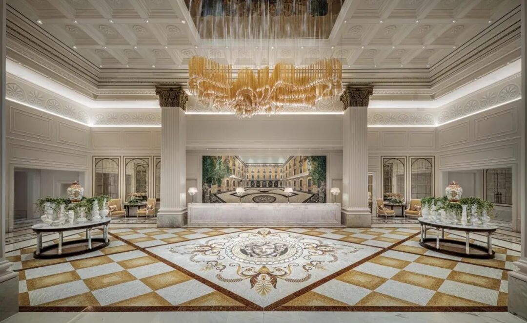 亚洲第一家范思哲酒店、澳门范思哲豪华酒店(Palazzo Versace Macau)位于澳门上葡京综合度假村内,酒店的大楼建筑由Donatella Versace(范思哲创始人妹妹)掌舵设计。酒店设计尽展意大利宫殿般雅致,经典美杜莎、希腊回纹、巴洛克图案与中国传统元素菊花和祥龙巧妙融和VERSACEHOME家居系列装点各处意式餐厅、水疗中心、室内户外泳池,呈现华丽典雅的意式生活美学。