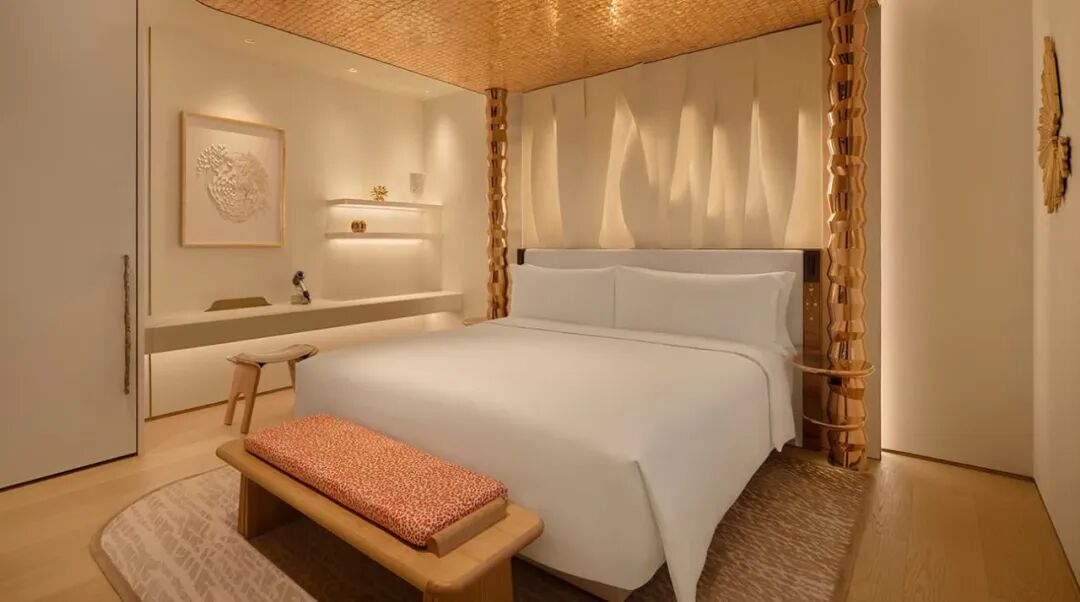 酒店由法国设计事务所 Moinard Bétaille 设计,空间宽敞,以自然绿植为设计元素,居住感受接近私人住宅,多数房间配有私人阳台和无边际泳池。四居室顶层套房还额外设有带按摩椅、健身器材的康养室,以及桌上足球等休闲空间。