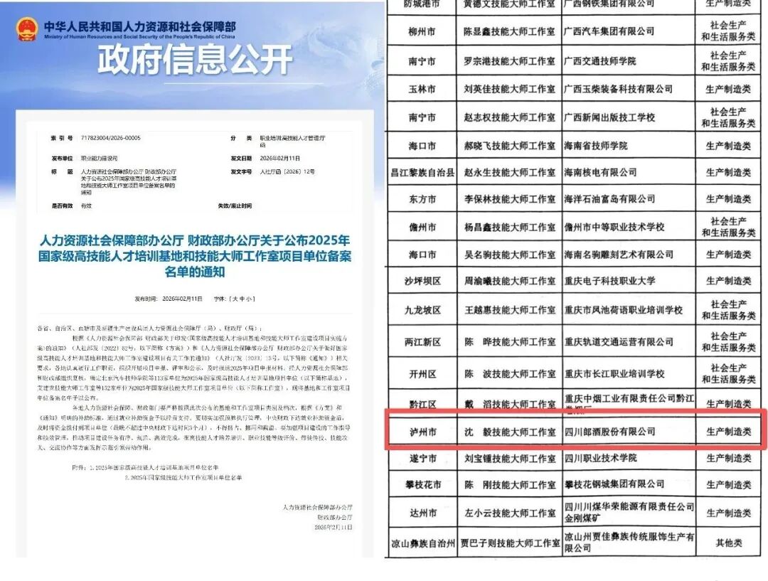 近日,人力资源社会保障部办公厅、财政部办公厅联合印发《关于公布2025年国家级高技能人才培训基地和技能大师工作室项目单位备案名单的通知》,郎酒股份沈毅技能大师工作室成功入选国家级技能大师工作室。