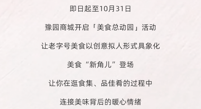 豫园食集亮相之际,「豫园商城·美食总动园」活动同期强势来袭,即日起至10月31日,以“食物活过来”为核心理念,将十余家老字号美食从历史长河中唤醒,个个化身为拥有鲜明个性的当家“美食er”,开启一场别开生面的美食派对!