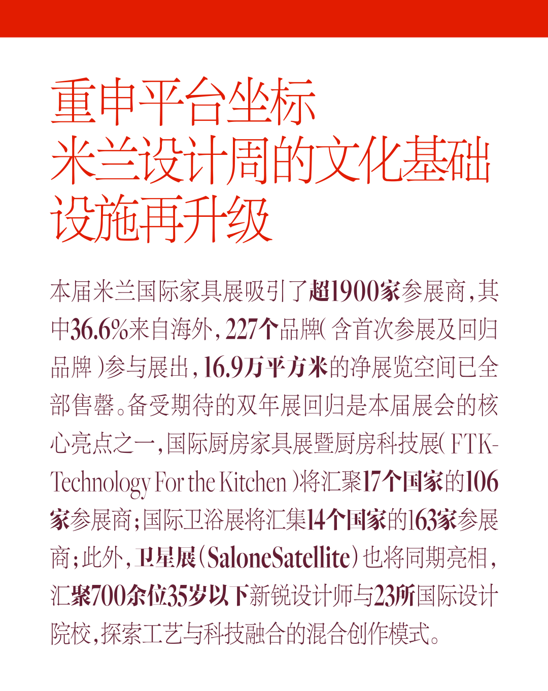 从更开放的互联结构,到更清晰可读的参观路径,再到双年展回归所带来的行业聚焦,第64届米兰国际家具展正在把展览重新做成一种更有方向感的公共叙事。它既回应当下的市场震荡与技术跃迁,也把材料、工艺与供应链等议题纳入同一套可被讨论、被验证的框架之中。与此同时,展会也为面向未来的新项目拉开序幕,提出 Salone Contract 这一长期计划。2026年4月21日至26日,米兰将再次成为设计与制造、文化与商业交汇的坐标点,在持续演变的世界里,给出一份更具确定性的设计答案。