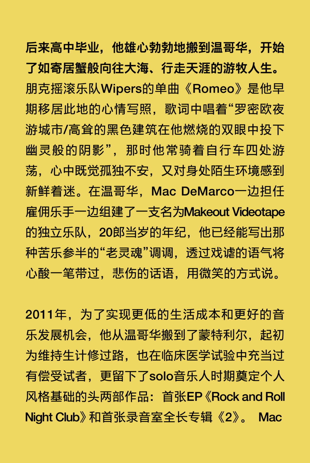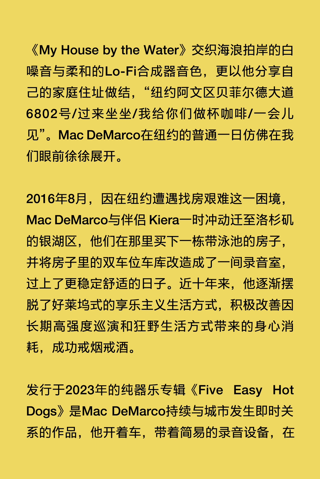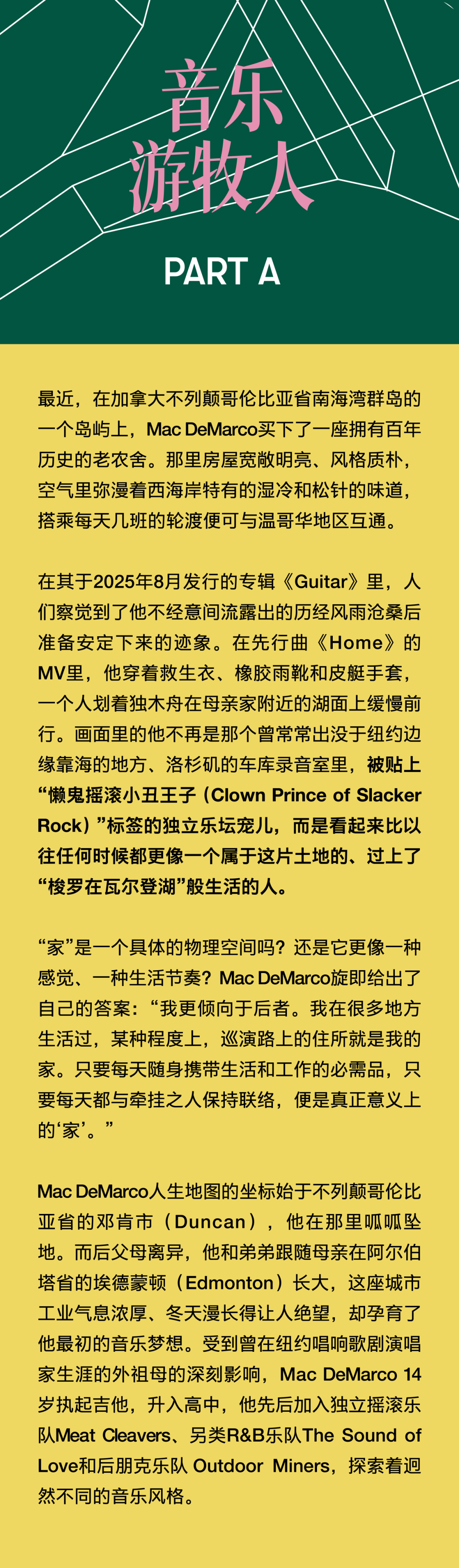 穿着松垮的卫衣、脚踩快穿烂的Vans滑板鞋,笑起来牙缝很醒目,Mac DeMarco就是这样一个周身散发着随性不费力魅力的“邻家怪咖”。 距离Mac DeMarco上一次中国巡演已经过去了13年之久,那时的他还只是一个透着“潦倒”气质、怪怪惹人爱的乐坛新人,正携全新个人专辑《2》为法国摇滚天团Phoenix的北美巡演担纲暖场嘉宾;而如今顶着“Lo-Fi美学开创者”“卧室流行音乐先行人”等诸多光环,即将年满36岁的他早已不再是那个试图征服世界的年轻人。 一晃多年过去,他在不同城市间穿梭,在电脑硬盘里翻找灵魂,戒掉了在酒精和尼古丁里醒复醉、醉还醒的精神依赖,并最终回到家乡开始新生活。Mac DeMarco的音乐不完美,交织着矛盾——有着漫不经心的正经、长吁短叹的惬意和诙谐的抒情,却又独享一份平稳闲适的呼吸和属于真实人类的温度。 音乐游牧人 最近,在加拿大不列颠哥伦比亚省南海湾群岛的一个岛屿上,Mac DeMarco买下了一座拥有百年历史的老农舍。那里房屋宽敞明亮、风格质朴,空气里弥漫着西海岸特有的湿冷和松针的味道,搭乘每天几班轮渡可与温哥华地区互通。 在其于2025年8月发行的专辑《Guitar》里,人们察觉到了他不经意间流露出的历经风雨沧桑后准备安定下来的迹象。在先行曲《Home》的MV里,他穿着救生衣、橡胶雨靴和皮艇手套,一个人划着独木舟在母亲家附近的湖面上缓慢前行。画面里的他不再是那个曾常常出没于纽约边缘靠海的地方、洛杉矶的车库录音室里,被贴上“懒鬼摇滚小丑王子(Clown Prince of Slacker Rock)”标签的独立乐坛宠儿,而是看起来比以往任何时候都更像一个属于这片土地的、过上了“梭罗在瓦尔登湖”般生活的人。 “家”是一个具体的物理空间吗?还是它更像一种感觉、一种生活节奏?Mac DeMarco旋即给出了自己的答案:“我更倾向于后者。我在很多地方生活过,某种程度上,巡演路上的住所就是我的家。只要每天随身携带生活和工作的必需品,只要每天都与牵挂之人保持联络,便是真正意义上的‘家’。” Mac DeMarco人生地图的坐标始于不列颠哥伦比亚省的邓肯市(Duncan),他在那里呱呱坠地。而后父母离异,他和弟弟跟随母亲在阿尔伯塔省的埃德蒙顿(Edmonton)长大,这座城市工业气息浓厚、冬天漫长得让人绝望,却孕育了他最初的音乐梦想。受曾在纽约唱响歌剧演唱家生涯的外祖母影响,Mac DeMarco 14岁执起吉他,升入高中,他先后加入独立摇滚乐队Meat Cleavers、另类R&B乐队The Sound of Love和后朋克乐队Outdoor Miners,探索着迥然不同的音乐风格。 后来高中毕业,他雄心勃勃地搬到温哥华,开始了如寄居蟹般向往大海、行走天涯的游牧人生。朋克摇滚乐队Wipers的单曲《Romeo》是他早期移居此地的心情写照,歌词中唱着“罗密欧夜游城市/高耸的黑色建筑在他燃烧的双眼中投下幽灵般的阴影”,那时他常骑着自行车四处游荡,心中既觉孤独不安,又对身处陌生环境感到新鲜着迷。在温哥华,Mac DeMarco一边担任雇佣乐手一边组建了一支名为Makeout Videotape的独立乐队,20郎当岁的年纪,他已经能写出那种苦乐参半的“老灵魂”调调,透过戏谑的语气将心酸一笔带过,悲伤的话语,用微笑的方式说。 2011年,为了实现更低的生活成本和更好的音乐发展机会,他从温哥华搬到了蒙特利尔,起初为维持生计修过路,也在临床医学试验中充当过有偿受试者,更留下了solo音乐人时期奠定个人风格基础的头两部作品:首张EP《Rock and Roll Night Club》和首张录音室全长专辑《2》。 Mac DeMarco将收录在首张EP里的《European Vegas》献给蒙特利尔这座城市,在这里,他经历了一段兜里虽然没什么钱却觉得自己正置身于世界中心的青春岁月,也学会了如何将生活的窘困转化成一种充满法式幽默的荒诞浪漫情境。被认为是北美地区最像欧洲的城市,蒙特利尔是仅次于巴黎的全球第二大法语城市,被誉为“北美小巴黎”,因而他才会在这首歌里这样唱道:“宝贝,牵着我的手走吧/我知道你想去巴黎,但这次就先凑合吧/别做梦了,女孩,我已经有了完美的计划/当你和你的爱人在一起时,这座城市其实没那么糟糕。” 因成功签约纽约著名独立唱片厂牌Captured Tracks,Mac DeMarco渐渐落脚到纽约定居,这座城市见证了他的二专《Salad Days》和情歌EP《Another One》爆火出圈。后者是他在位于皇后区濒临大西洋的法洛克威半岛(Far Rockaway)的家中录制完成的,EP结尾的氛围器乐曲《My House by the Water》交织海浪拍岸的白噪音与柔和的Lo-Fi合成器音色,更以他分享自己的家庭住址做结,“纽约阿文区贝菲尔德大道6802号/过来坐坐/我给你们做杯咖啡/一会儿见”。Mac Demarco在纽约的普通一日仿佛在我们眼前徐徐展开。 2016年8月,因遭遇纽约找房困境,Mac Demarco与伴侣Kiera一时冲动迁至洛杉矶的银湖区,他们在那里买下一栋带泳池的房子,并将房子里的双车位车库改造成了一间录音室,过上了更稳定舒适的日子。近十年来,他逐渐摆脱了好莱坞式的享乐主义生活方式,积极改善因长期高强度巡演和狂野生活方式带来的身心消耗,成功戒烟戒酒。 发行于2023年的纯器乐专辑《Five Easy Hot Dogs》是Mac DeMarco持续与城市发生即时关系的作品,他开着车,带着简易的录音设备,在公路旅行中捕捉着不同地方、不同空气带给自己的不同心境。专辑中的14首曲目全部以录制该曲的城市命名,曲序严格遵循旅行足迹排列,让创作回归最纯粹的生活记录。 开