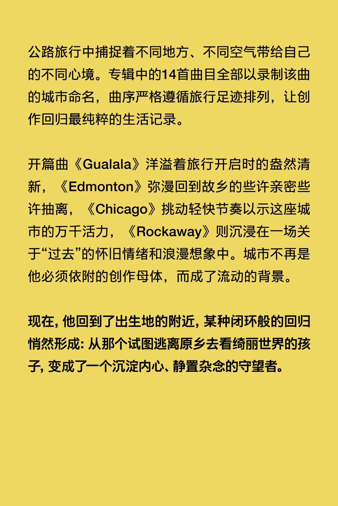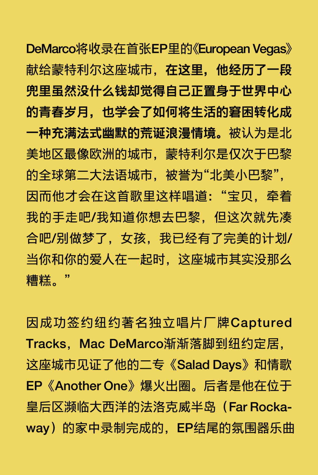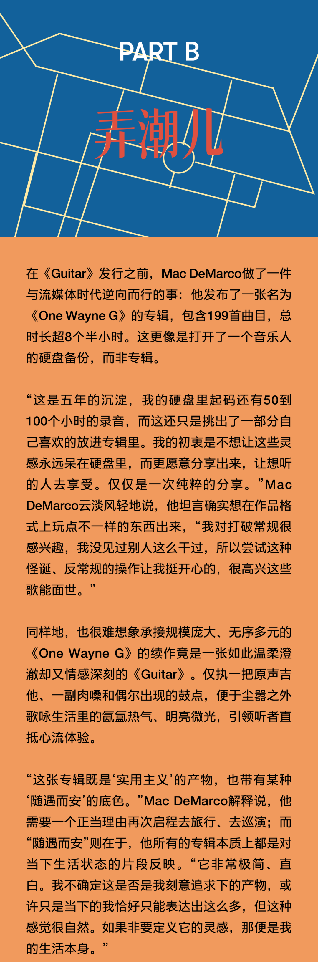 穿着松垮的卫衣、脚踩快穿烂的Vans滑板鞋,笑起来牙缝很醒目,Mac DeMarco就是这样一个周身散发着随性不费力魅力的“邻家怪咖”。 距离Mac DeMarco上一次中国巡演已经过去了13年之久,那时的他还只是一个透着“潦倒”气质、怪怪惹人爱的乐坛新人,正携全新个人专辑《2》为法国摇滚天团Phoenix的北美巡演担纲暖场嘉宾;而如今顶着“Lo-Fi美学开创者”“卧室流行音乐先行人”等诸多光环,即将年满36岁的他早已不再是那个试图征服世界的年轻人。 一晃多年过去,他在不同城市间穿梭,在电脑硬盘里翻找灵魂,戒掉了在酒精和尼古丁里醒复醉、醉还醒的精神依赖,并最终回到家乡开始新生活。Mac DeMarco的音乐不完美,交织着矛盾——有着漫不经心的正经、长吁短叹的惬意和诙谐的抒情,却又独享一份平稳闲适的呼吸和属于真实人类的温度。 音乐游牧人 最近,在加拿大不列颠哥伦比亚省南海湾群岛的一个岛屿上,Mac DeMarco买下了一座拥有百年历史的老农舍。那里房屋宽敞明亮、风格质朴,空气里弥漫着西海岸特有的湿冷和松针的味道,搭乘每天几班轮渡可与温哥华地区互通。 在其于2025年8月发行的专辑《Guitar》里,人们察觉到了他不经意间流露出的历经风雨沧桑后准备安定下来的迹象。在先行曲《Home》的MV里,他穿着救生衣、橡胶雨靴和皮艇手套,一个人划着独木舟在母亲家附近的湖面上缓慢前行。画面里的他不再是那个曾常常出没于纽约边缘靠海的地方、洛杉矶的车库录音室里,被贴上“懒鬼摇滚小丑王子(Clown Prince of Slacker Rock)”标签的独立乐坛宠儿,而是看起来比以往任何时候都更像一个属于这片土地的、过上了“梭罗在瓦尔登湖”般生活的人。 “家”是一个具体的物理空间吗?还是它更像一种感觉、一种生活节奏?Mac DeMarco旋即给出了自己的答案:“我更倾向于后者。我在很多地方生活过,某种程度上,巡演路上的住所就是我的家。只要每天随身携带生活和工作的必需品,只要每天都与牵挂之人保持联络,便是真正意义上的‘家’。” Mac DeMarco人生地图的坐标始于不列颠哥伦比亚省的邓肯市(Duncan),他在那里呱呱坠地。而后父母离异,他和弟弟跟随母亲在阿尔伯塔省的埃德蒙顿(Edmonton)长大,这座城市工业气息浓厚、冬天漫长得让人绝望,却孕育了他最初的音乐梦想。受曾在纽约唱响歌剧演唱家生涯的外祖母影响,Mac DeMarco 14岁执起吉他,升入高中,他先后加入独立摇滚乐队Meat Cleavers、另类R&B乐队The Sound of Love和后朋克乐队Outdoor Miners,探索着迥然不同的音乐风格。 后来高中毕业,他雄心勃勃地搬到温哥华,开始了如寄居蟹般向往大海、行走天涯的游牧人生。朋克摇滚乐队Wipers的单曲《Romeo》是他早期移居此地的心情写照,歌词中唱着“罗密欧夜游城市/高耸的黑色建筑在他燃烧的双眼中投下幽灵般的阴影”,那时他常骑着自行车四处游荡,心中既觉孤独不安,又对身处陌生环境感到新鲜着迷。在温哥华,Mac DeMarco一边担任雇佣乐手一边组建了一支名为Makeout Videotape的独立乐队,20郎当岁的年纪,他已经能写出那种苦乐参半的“老灵魂”调调,透过戏谑的语气将心酸一笔带过,悲伤的话语,用微笑的方式说。 2011年,为了实现更低的生活成本和更好的音乐发展机会,他从温哥华搬到了蒙特利尔,起初为维持生计修过路,也在临床医学试验中充当过有偿受试者,更留下了solo音乐人时期奠定个人风格基础的头两部作品:首张EP《Rock and Roll Night Club》和首张录音室全长专辑《2》。 Mac DeMarco将收录在首张EP里的《European Vegas》献给蒙特利尔这座城市,在这里,他经历了一段兜里虽然没什么钱却觉得自己正置身于世界中心的青春岁月,也学会了如何将生活的窘困转化成一种充满法式幽默的荒诞浪漫情境。被认为是北美地区最像欧洲的城市,蒙特利尔是仅次于巴黎的全球第二大法语城市,被誉为“北美小巴黎”,因而他才会在这首歌里这样唱道:“宝贝,牵着我的手走吧/我知道你想去巴黎,但这次就先凑合吧/别做梦了,女孩,我已经有了完美的计划/当你和你的爱人在一起时,这座城市其实没那么糟糕。” 因成功签约纽约著名独立唱片厂牌Captured Tracks,Mac DeMarco渐渐落脚到纽约定居,这座城市见证了他的二专《Salad Days》和情歌EP《Another One》爆火出圈。后者是他在位于皇后区濒临大西洋的法洛克威半岛(Far Rockaway)的家中录制完成的,EP结尾的氛围器乐曲《My House by the Water》交织海浪拍岸的白噪音与柔和的Lo-Fi合成器音色,更以他分享自己的家庭住址做结,“纽约阿文区贝菲尔德大道6802号/过来坐坐/我给你们做杯咖啡/一会儿见”。Mac Demarco在纽约的普通一日仿佛在我们眼前徐徐展开。 2016年8月,因遭遇纽约找房困境,Mac Demarco与伴侣Kiera一时冲动迁至洛杉矶的银湖区,他们在那里买下一栋带泳池的房子,并将房子里的双车位车库改造成了一间录音室,过上了更稳定舒适的日子。近十年来,他逐渐摆脱了好莱坞式的享乐主义生活方式,积极改善因长期高强度巡演和狂野生活方式带来的身心消耗,成功戒烟戒酒。 发行于2023年的纯器乐专辑《Five Easy Hot Dogs》是Mac DeMarco持续与城市发生即时关系的作品,他开着车,带着简易的录音设备,在公路旅行中捕捉着不同地方、不同空气带给自己的不同心境。专辑中的14首曲目全部以录制该曲的城市命名,曲序严格遵循旅行足迹排列,让创作回归最纯粹的生活记录。 开