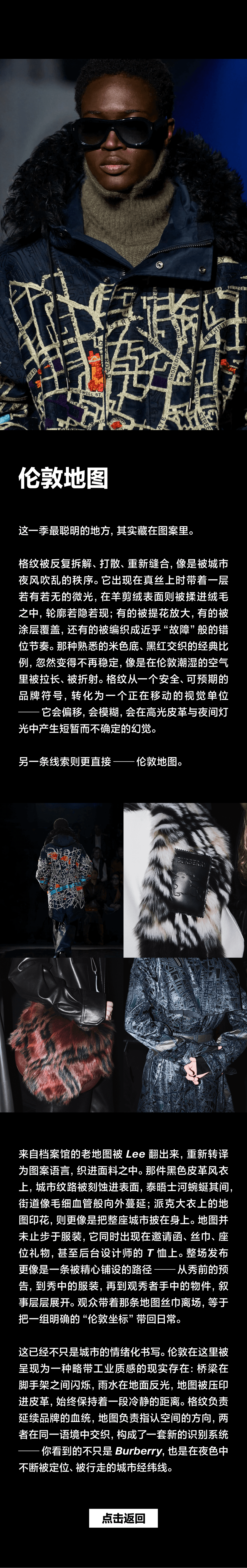这已经不只是城市的情绪化书写。伦敦在这里被呈现为一种略带工业质感的现实存在:桥梁在脚手架之间闪烁,雨水在地面反光,地图被压印进皮革,始终保持着一段冷静的距离。Nova 格纹负责延续品牌的血统,地图负责指认空间的方向,两者在同一语境中交织,构成了一套新的识别系统 —— 你看到的不只是 Burberry,也是在夜色中不断被定位、被行走的城市经纬线。
