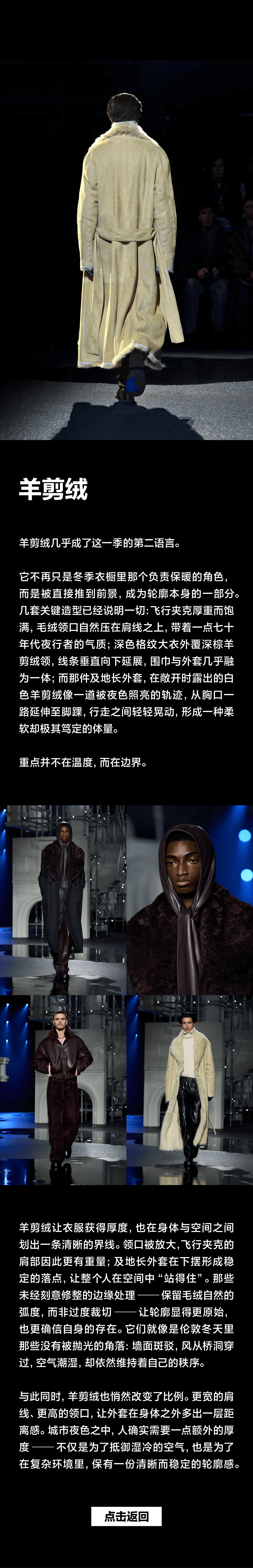 它不再只是冬季衣橱里那个负责保暖的角色,而是被直接推到前景,成为轮廓本身的一部分。几套关键造型已经说明一切:飞行夹克厚重而饱满,毛绒领口自然压在肩线之上,带着一点七十年代夜行者的气质;深色格纹大衣外覆深棕羊剪绒领,线条垂直向下延展,围巾与外套几乎融为一体;而那件及地长外套,在敞开时露出的白色羊剪绒像一道被夜色照亮的轨迹,从胸口一路延伸至脚踝,行走之间轻轻晃动,形成一种柔软却极其笃定的体量。