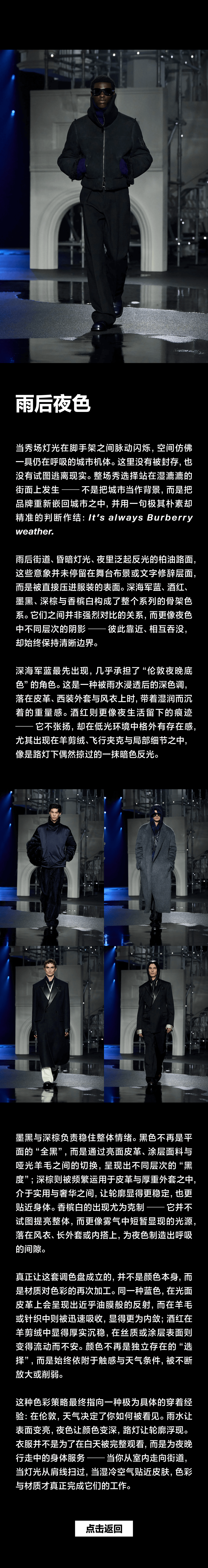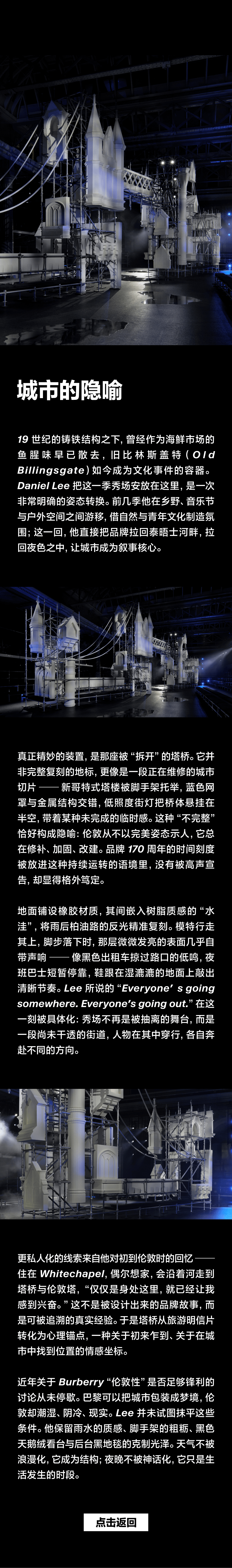 当秀场灯光在脚手架之间脉动闪烁,空间仿佛一具仍在呼吸的城市机体。这里没有被封存,也没有试图逃离现实。整场秀选择站在湿漉漉的街面上发生 —— 不是把城市当作背景,而是把品牌重新嵌回城市之中,并用一句极其朴素却精准的判断作结:It’s always Burberry weather.