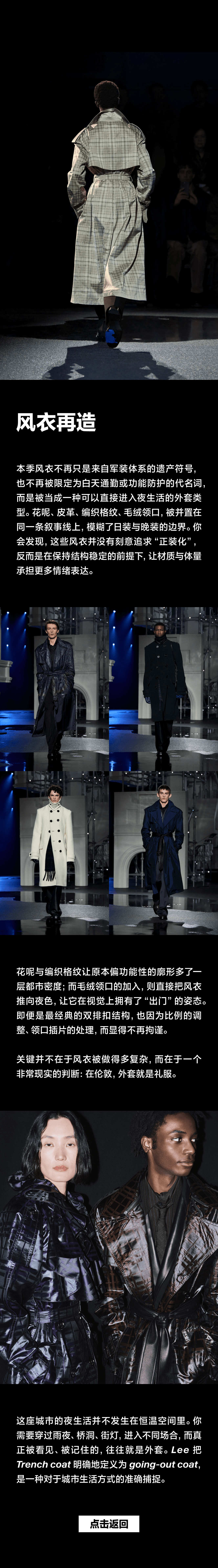 这座城市的夜生活并不发生在恒温空间里。你需要穿过雨夜、桥洞、街灯,进入不同场合,而真正被看见、被记住的,往往就是外套。Lee 把 Trench coat 明确地定义为 going-out coat,是一种对于城市生活方式的准确捕捉。