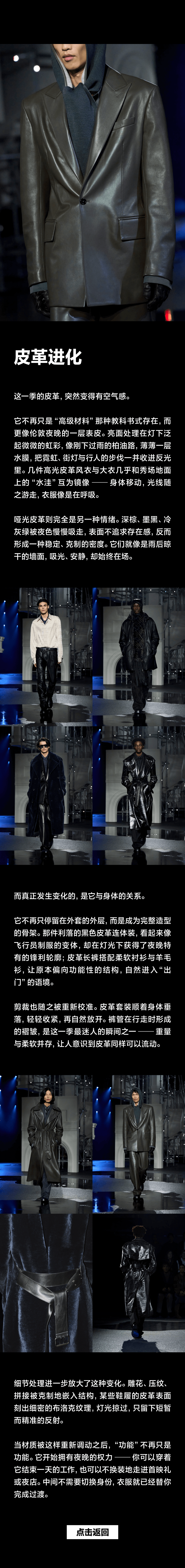 它不再只是“高级材料”那种教科书式存在,而更像伦敦夜晚的一层表皮。亮面处理在灯下泛起微微的虹彩,像刚下过雨的柏油路,薄薄一层水膜,把霓虹、街灯与行人的步伐一并收进反光里。几件高光皮革风衣与大衣几乎和秀场地面上的“水洼”互为镜像 —— 身体移动,光线随之游走,衣服像是在呼吸。