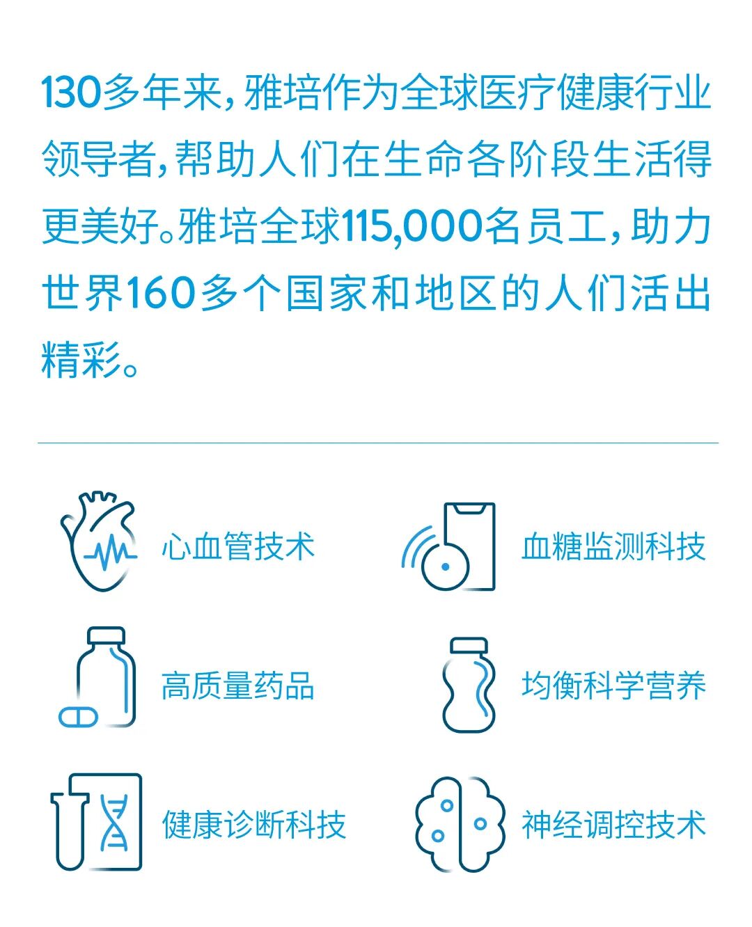 作为世界领先的医学营养品牌,雅培每天帮助800多万人获取所需营养,到2030年有望为全球30亿人的健康提供产品和服务。包含了全营养系列、针对特殊人群疾病相关性营养配方系列(比如帮助糖尿病等慢性疾病患者进行营养管理)以及帮助人们保持健康活力的全线营养品。