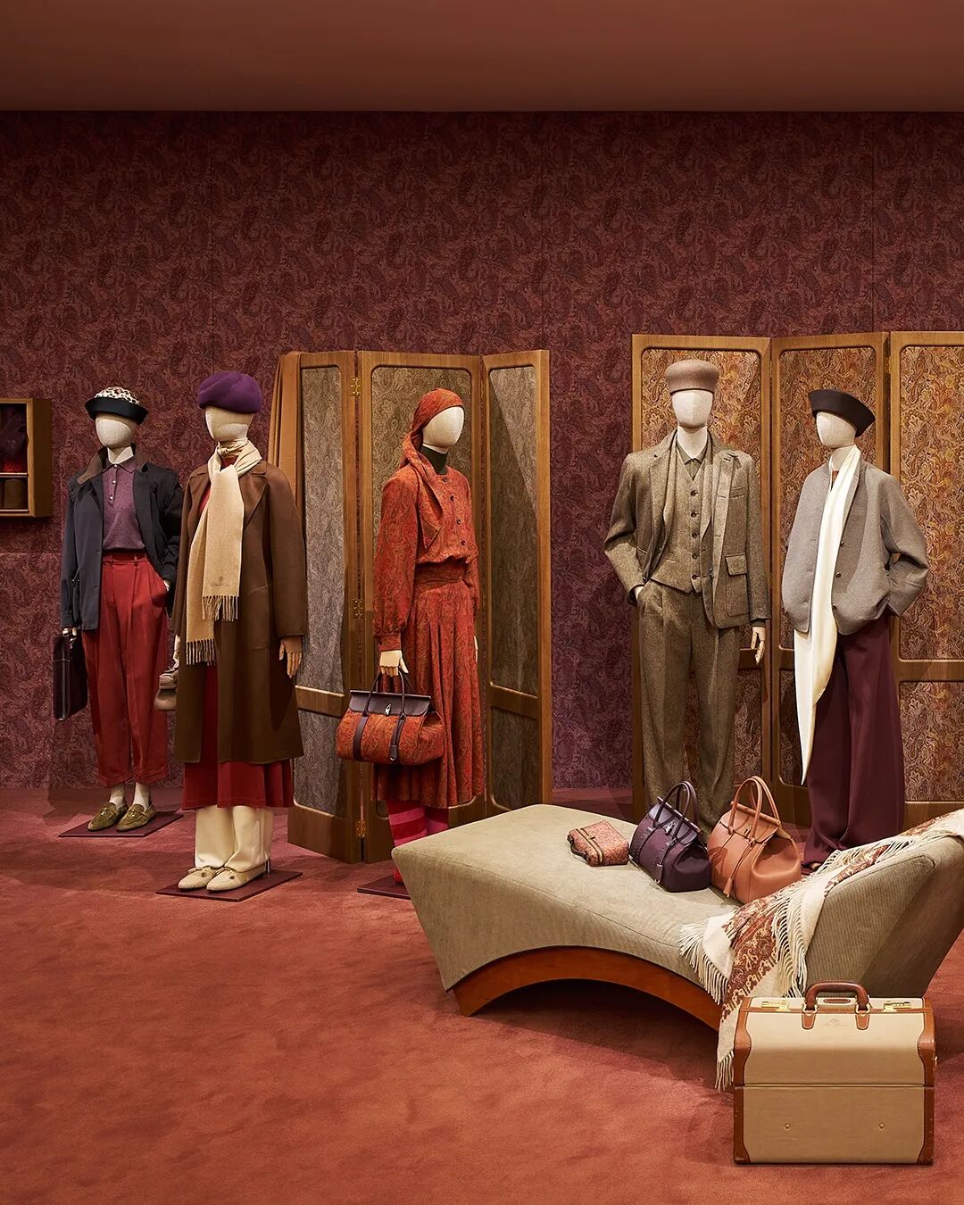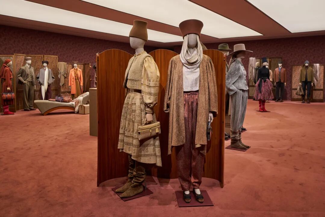 由此进入中央展厅,本季的故事真正展开。拥有两千年历史的佩斯利花纹,成为视觉上贯穿整个系列的灵魂。整个空间以深沉的大地色和南瓜色调为主,墙面铺满佩斯利花纹墙纸,花纹又从墙面蔓延至屏风。屏风错落摆放,一旁堆叠着复古的行李箱,氛围感十足。