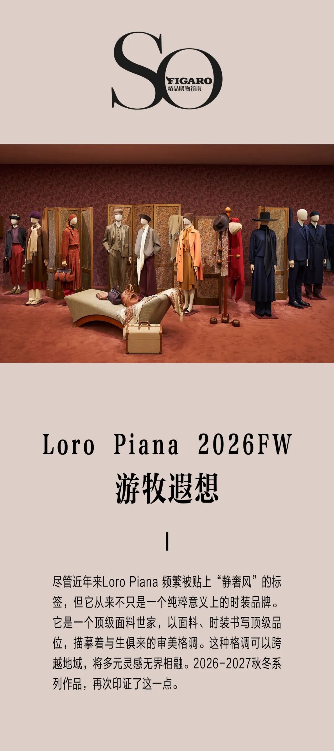 2026-2027秋冬系列,像是一封情书,写给Loro Piana与佩斯利花纹相伴的漫长岁月。它承载着历经岁月沉淀的精湛工艺,也拥抱着对未来的创新。这一系列所构筑的游牧遐想 (Nomadic Reverie),既是一场远行,也是一场回归Loro Piana本源的归途。