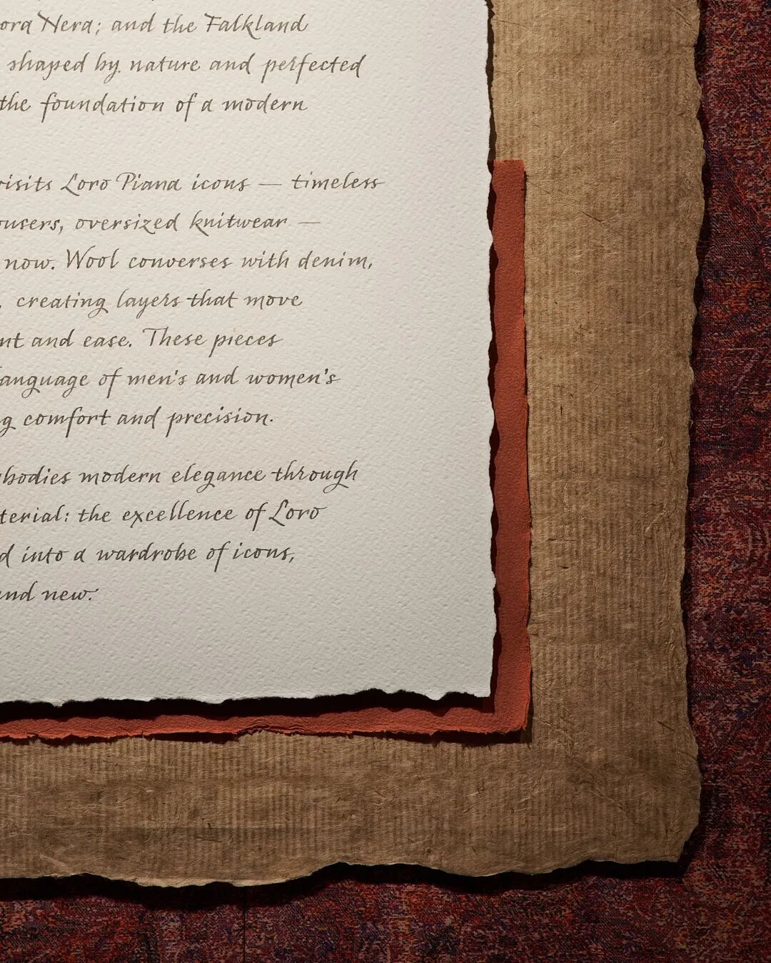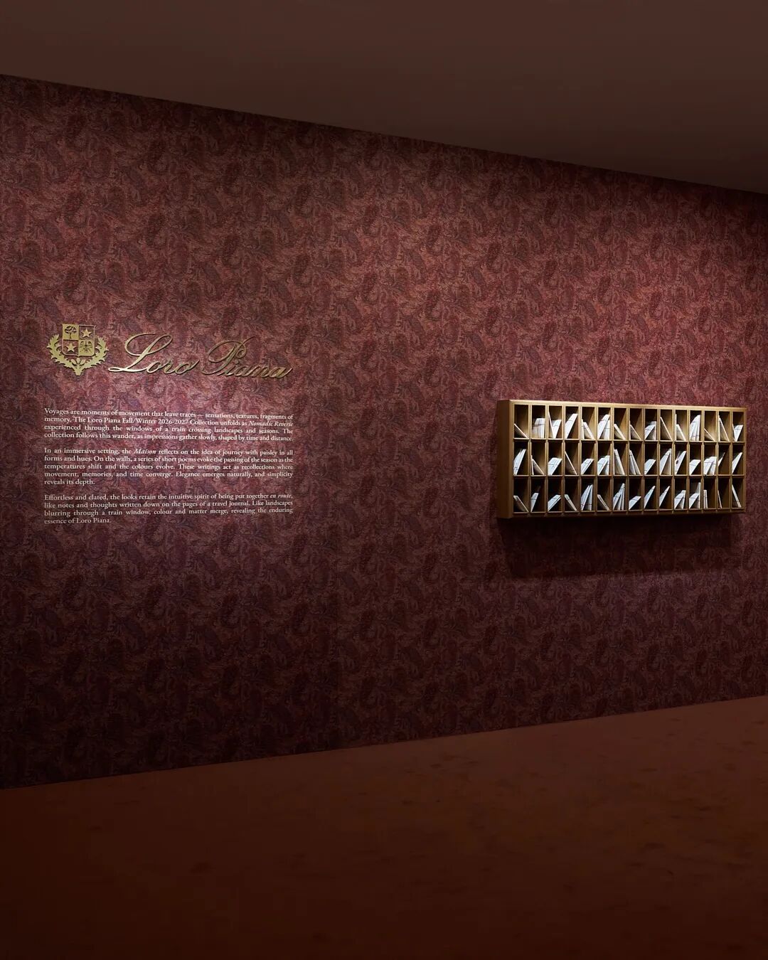 进入主展厅之前,一系列短诗率先映入眼帘。悬挂的诗集与画外音的轻诵,如记忆中的序曲,轻声诉说着季节的更迭、气温的缓缓变化以及色彩的变幻。这是一种极为Loro Piana式的开场:不急于呈现时装,而是先营造心境。