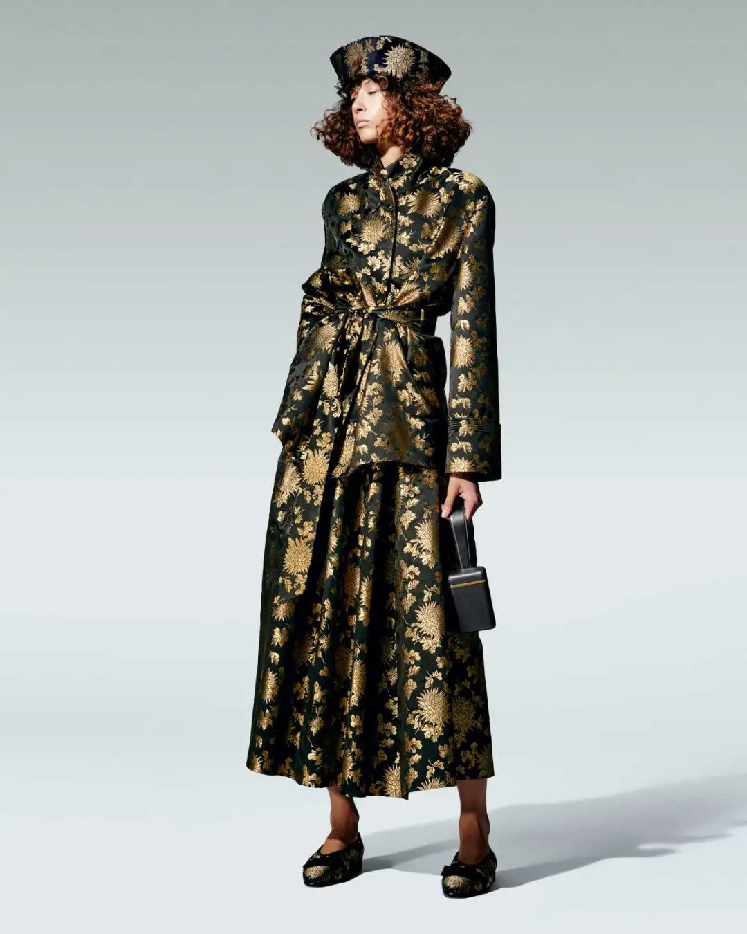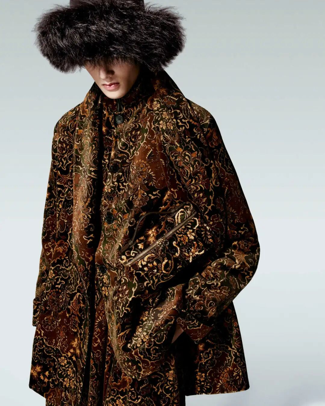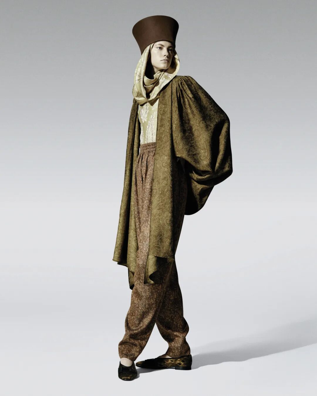 另外还有一套同色系的佩斯利提花真丝长裙,叠穿羔羊皮马甲,脚下是褶皱麂皮短靴,头戴一顶圆筒毡帽,优雅中透着充满诗意的漂泊感。旁边的另一套造型则显得更为随性:模特身穿宽松长大衣、佩斯利花纹休闲长裤与单鞋,宽大的披肩用作头巾,外面叠戴一顶高耸的毡帽,游牧气质浑然天成。