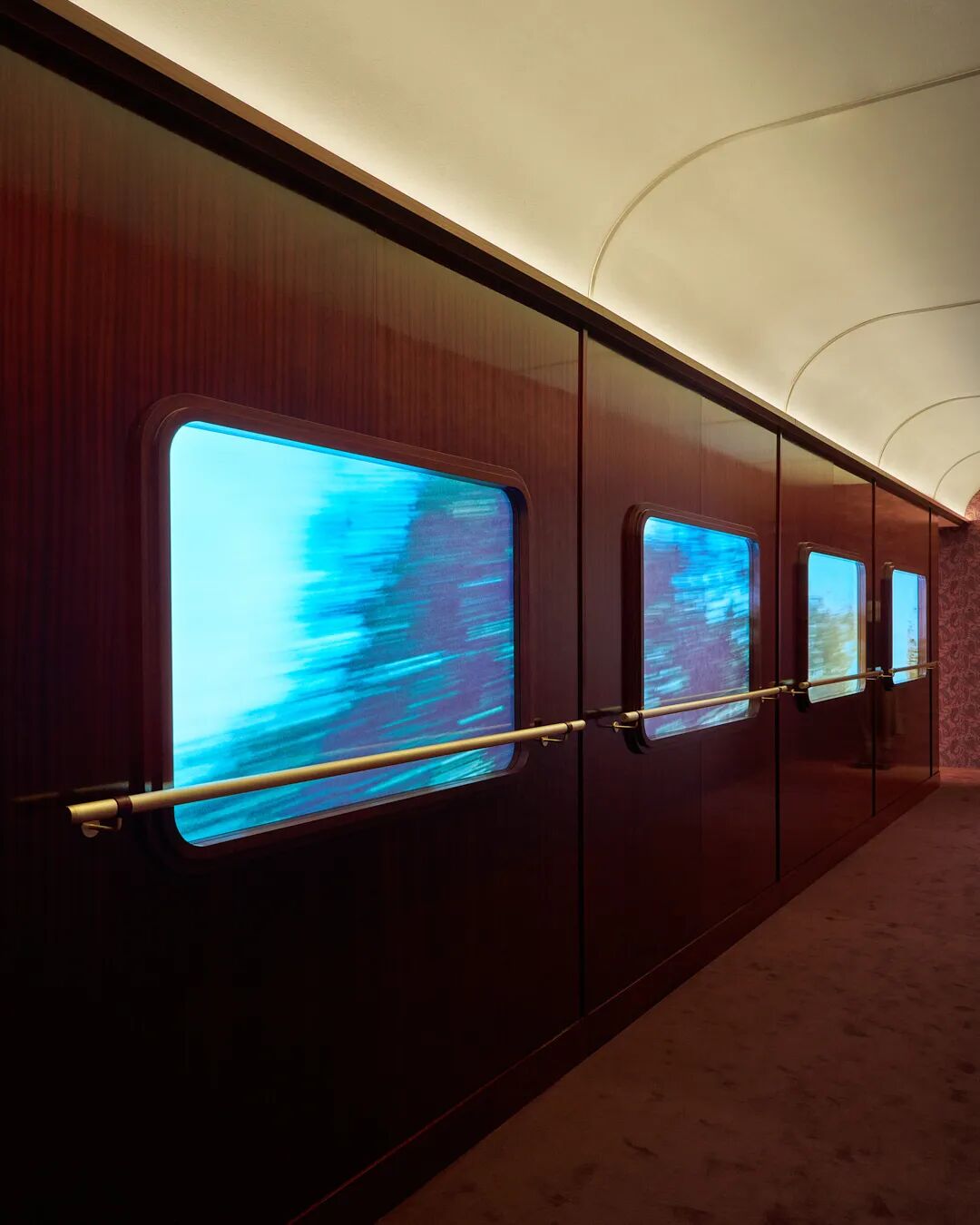 步入通往主展厅的走廊,就像穿行在行驶中的列车长廊,窗外是转瞬即逝的异域景象,恰似穿越一片想象中的地理空间,将遥远的异域与当下交织融合。