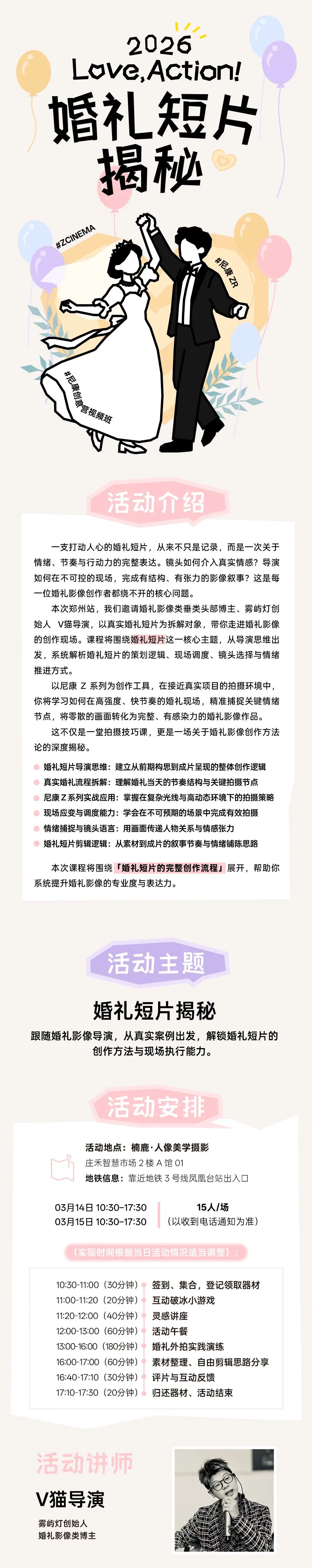 摘要:本次郑州站,我们邀请婚礼影像类垂类头部博主、雾屿灯创始人V猫导演,以真实婚礼短片为拆解对象,带你走进婚礼影像的创作现场。