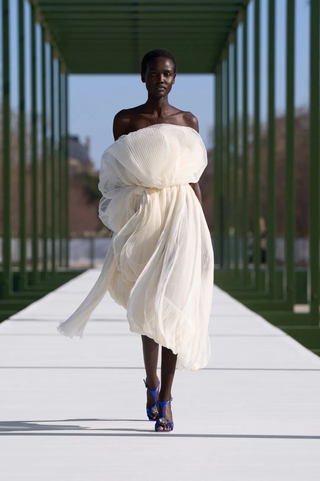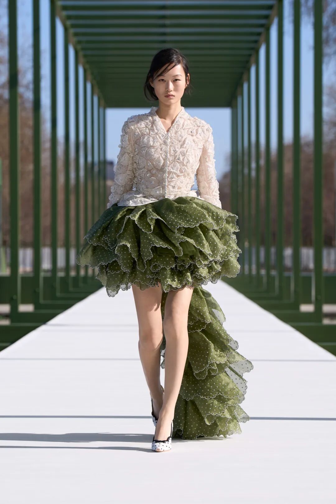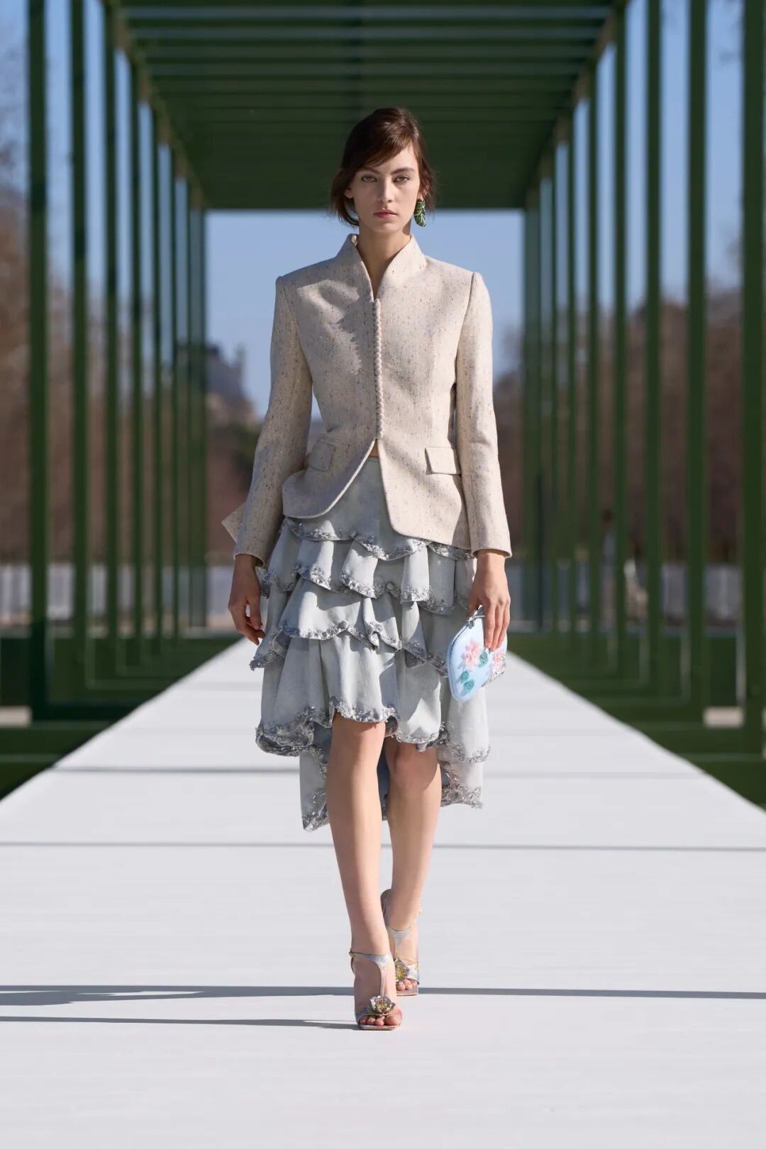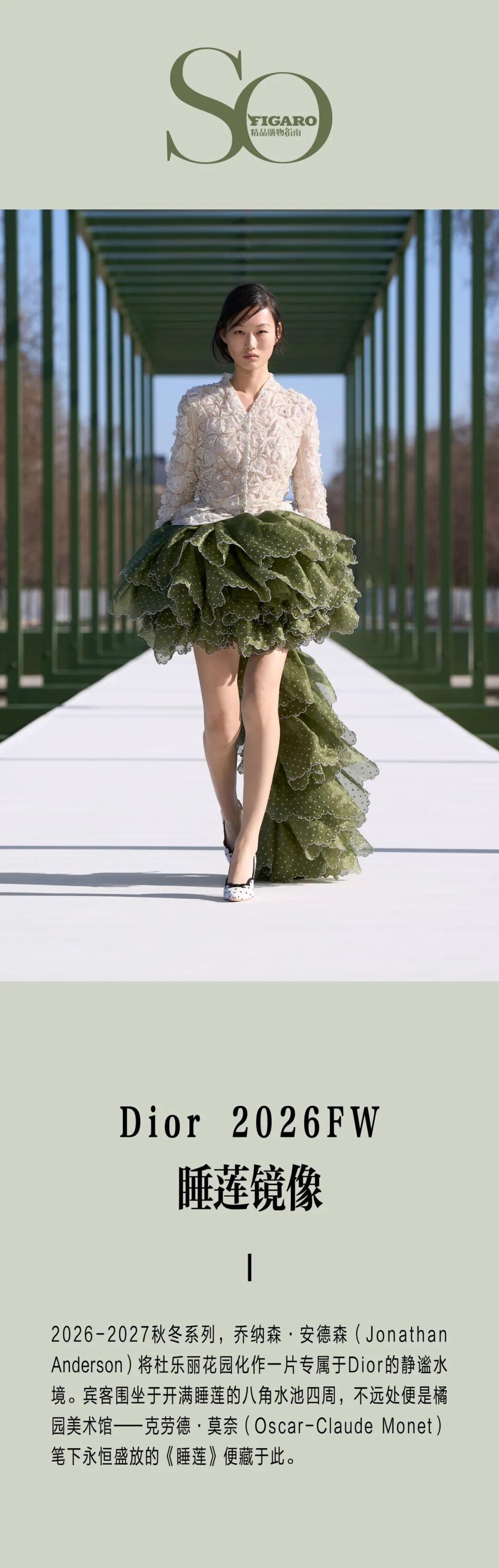 我们在整个系列中都能看到这种多重视角的表达。剪裁精准克制的短款Bar Jacket、针织开衫的利落收襟廓形,致敬迪奥的经典元素。而下半身则画风一转,裙摆膨起曳地,层层薄纱与真丝交织,随模特步履轻盈浮动、摇曳生姿。上半身的克制与下半身的舒展形成强烈对比。正如睡莲,表面沉静安稳,水下却隐匿着层次与张力。着装本身也是一场自我映照:我们通过时装塑造外在形象,再让这份形象折射出内心的自我。