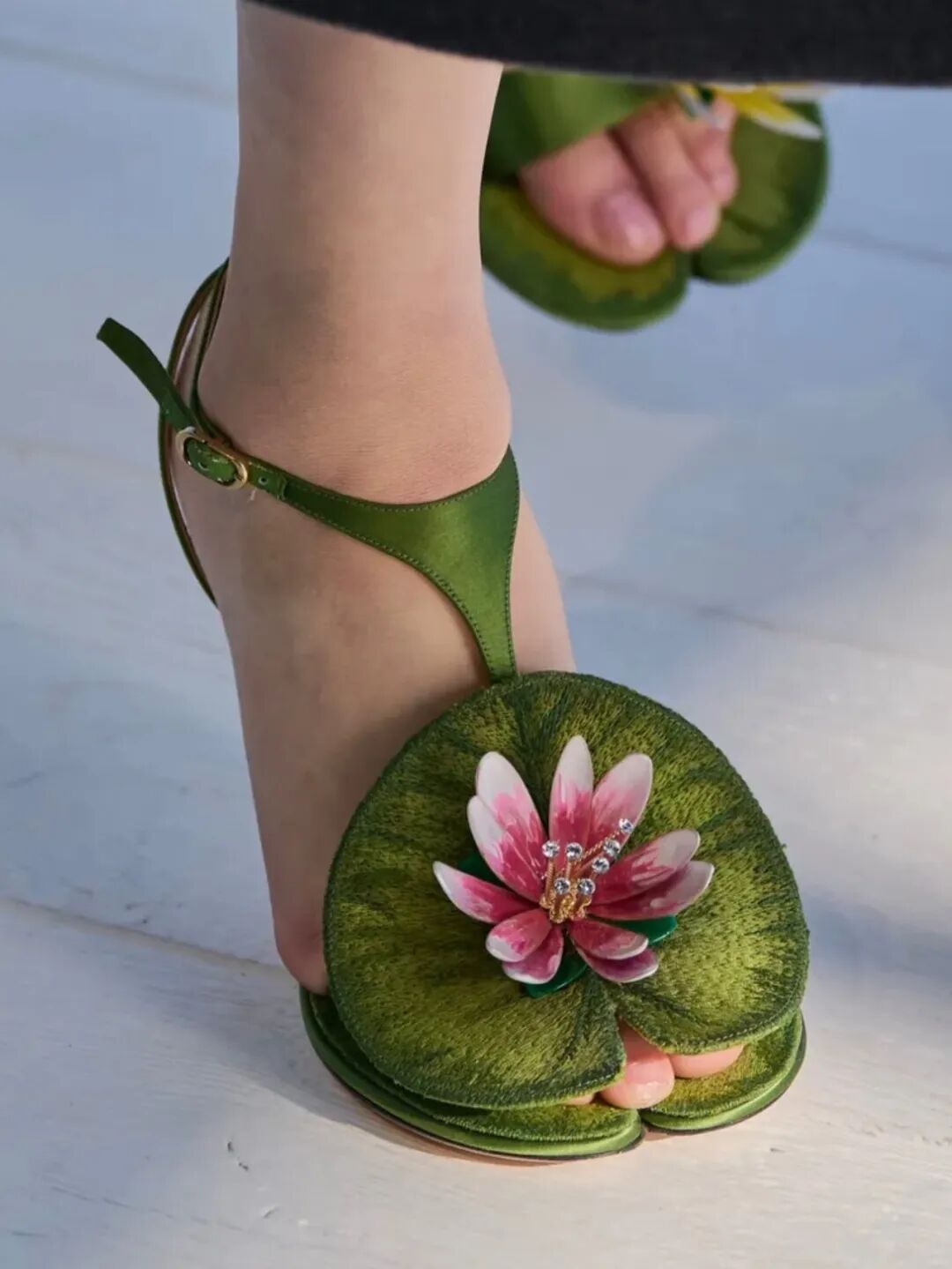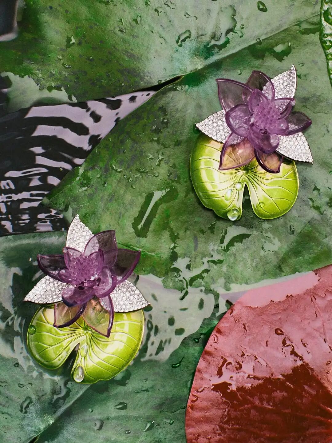 趣味十足的系列配饰作品紧扣主题,例如睡莲纹绿色高跟鞋,鞋履在脚趾绑带处点缀睡莲与玫瑰图案。花瓣与叶片造型的耳环,随转头动作轻掠光影。