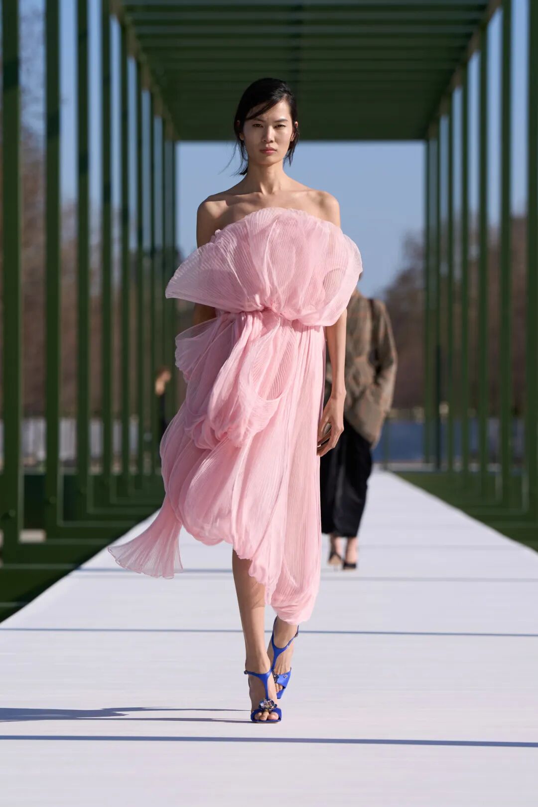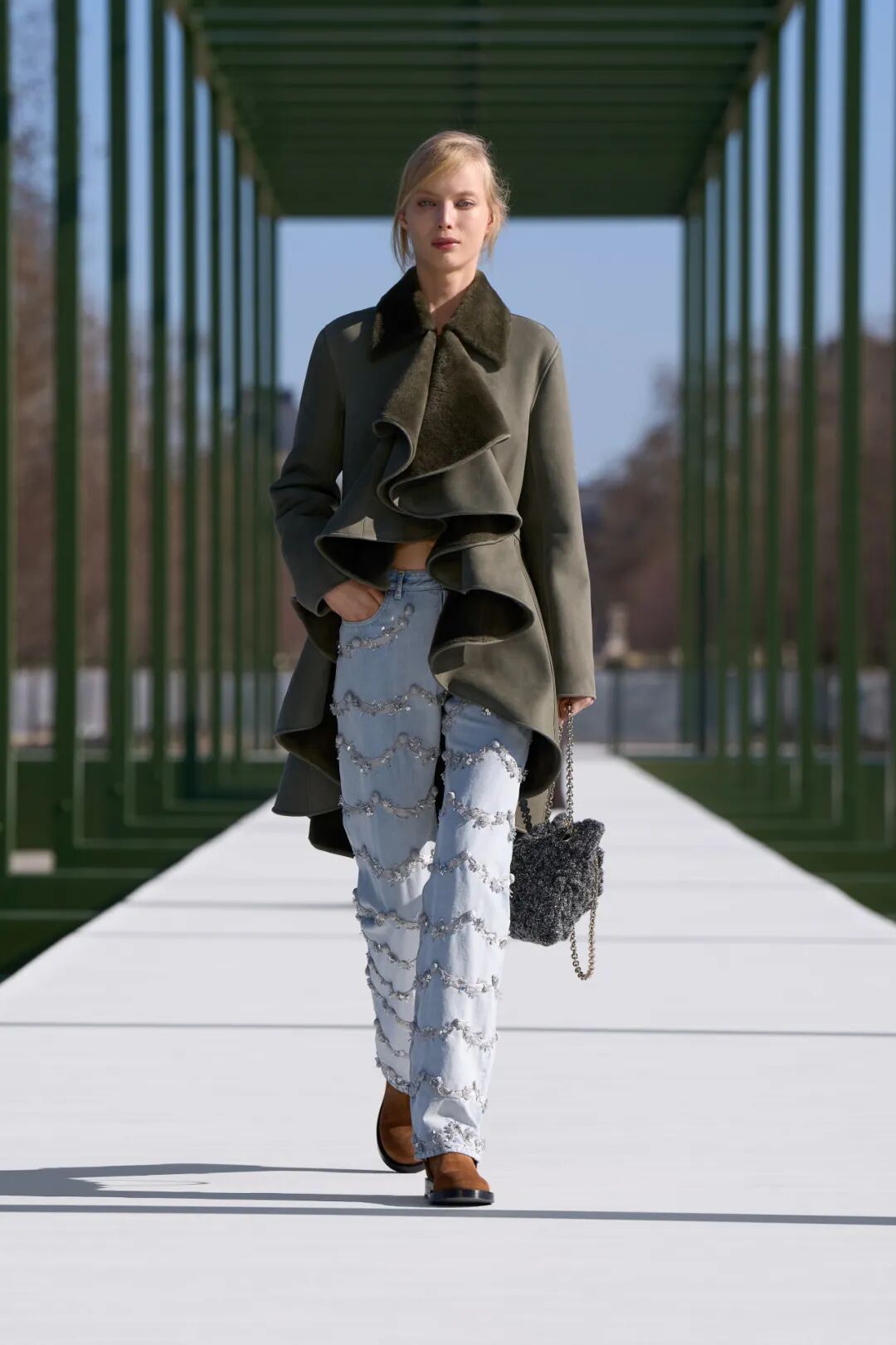 印象派的影响,还体现在色调和面料上。通常,秋冬季时装偏爱浓郁的大地色调、厚重的丝绒与皮革材质,而安德森笔下的秋冬,却更轻盈、更明亮。本季时装的色彩以浅水粉、青苔绿与象牙白为主,与秀场的睡莲水境氛围浑然一体。而部分带有金属光泽面料上折射出的淡彩,微光流转,仿佛经水面折射而成。