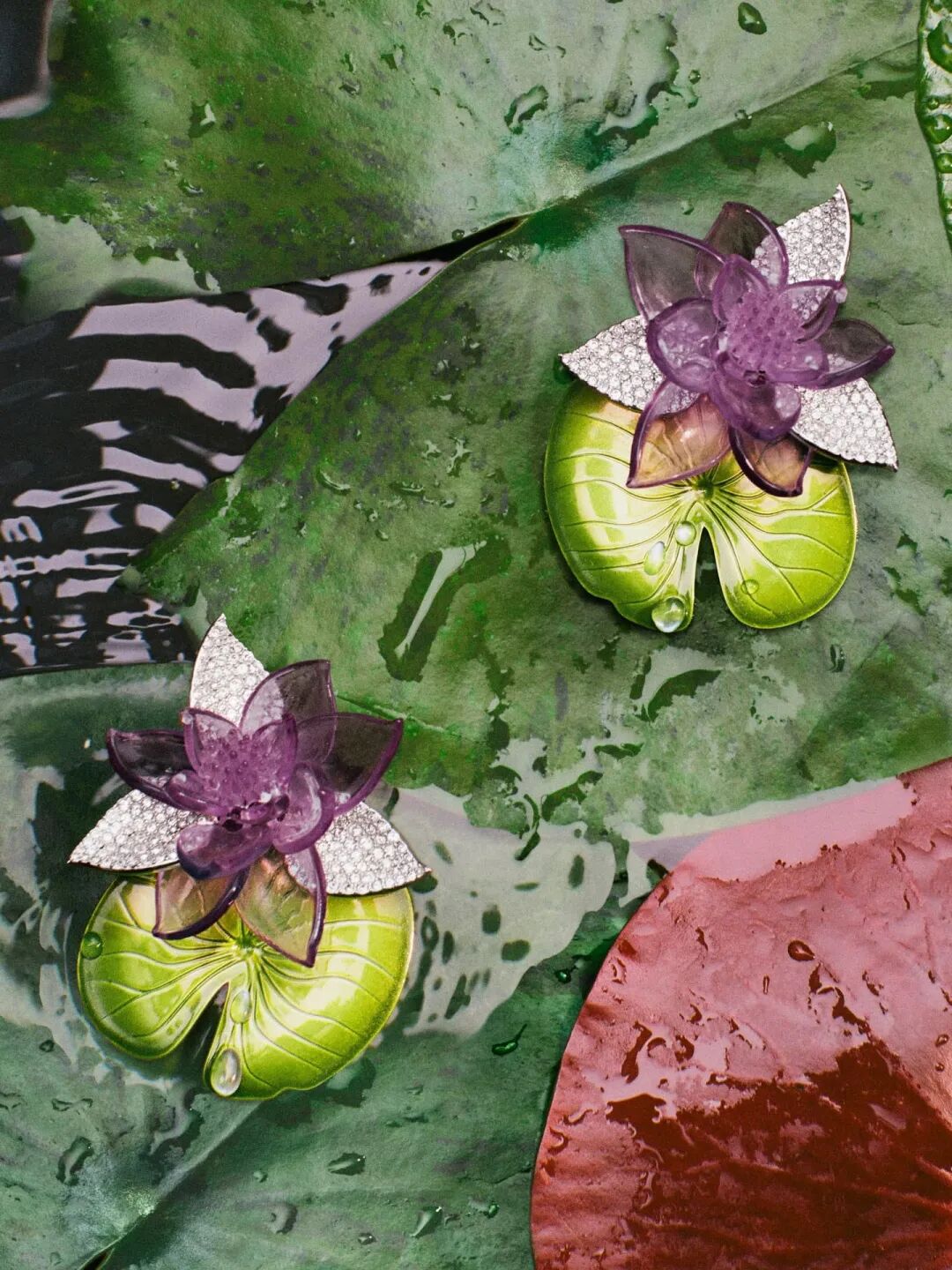 最直接的表达来自花卉装饰。睡莲、马蹄莲、玫瑰、康乃馨与罂粟反复出现,有时以印花的形式铺陈在夹克与长裤上,有时则被做成立体装饰缝在衣服表面。一些凉鞋甚至被设计成“错位花朵”的组合——一只鞋上是一朵马蹄莲,另一只则是展开的花冠,看起来像刚刚从花园里摘下来的植物,被轻轻放在脚背之上。