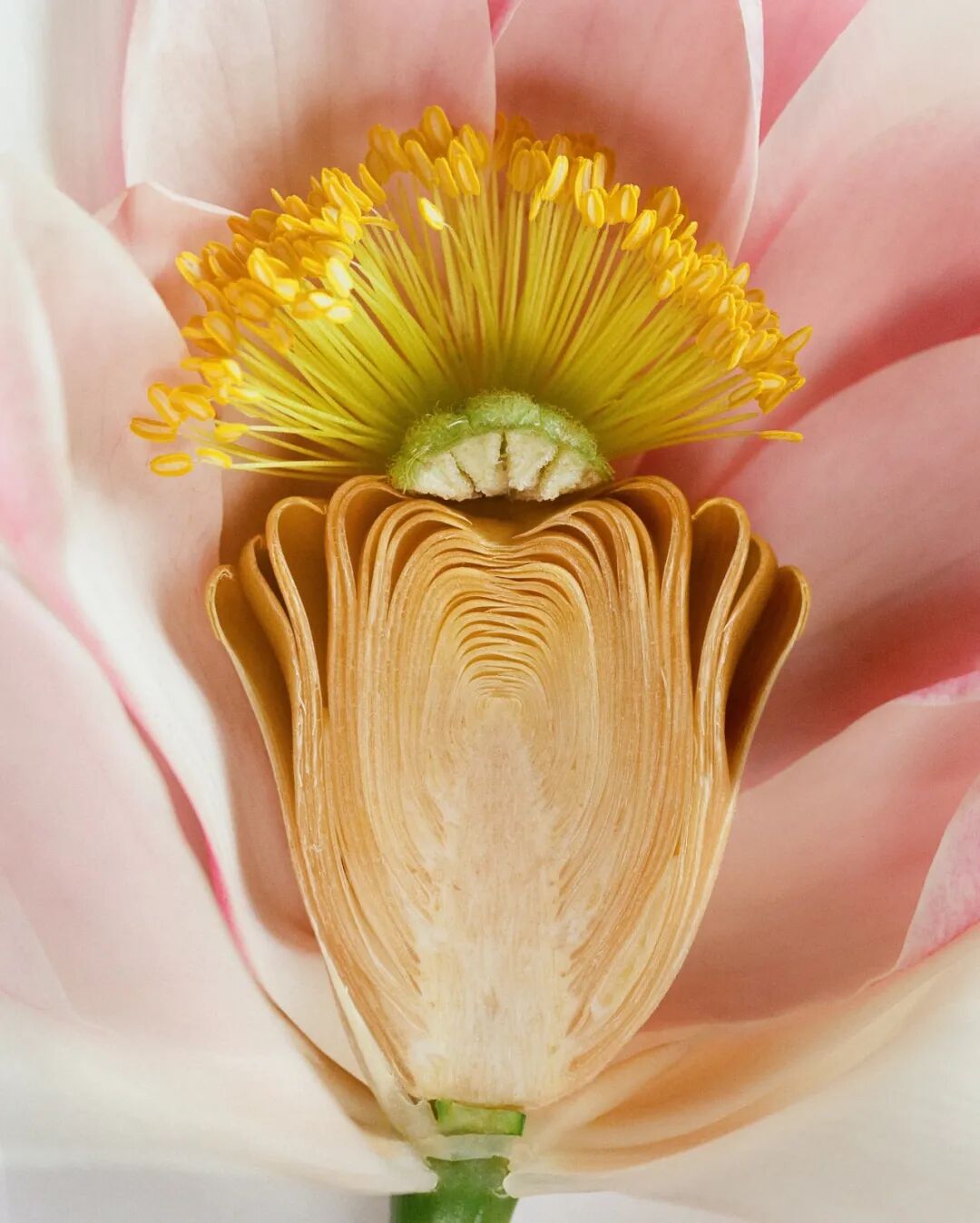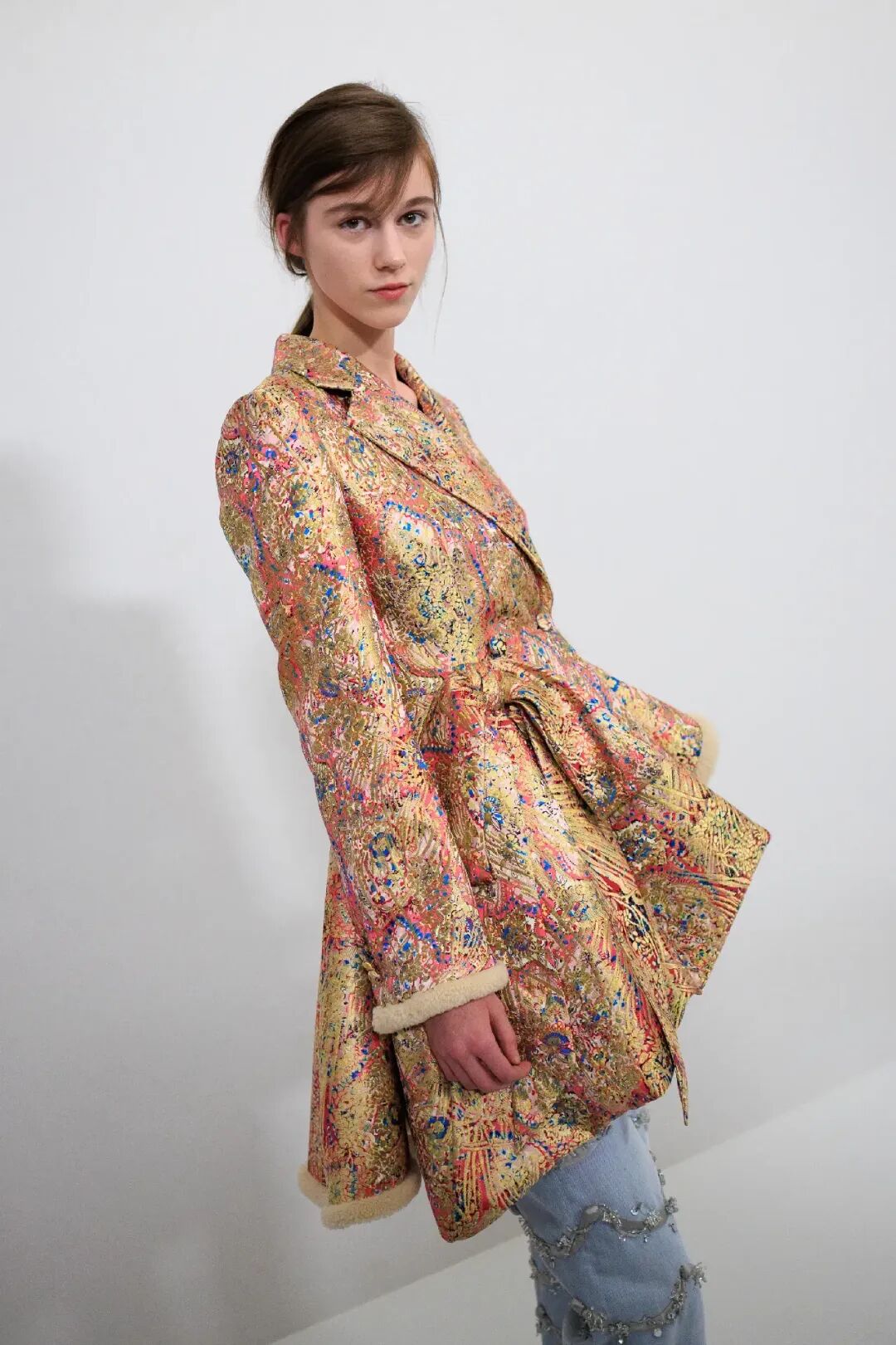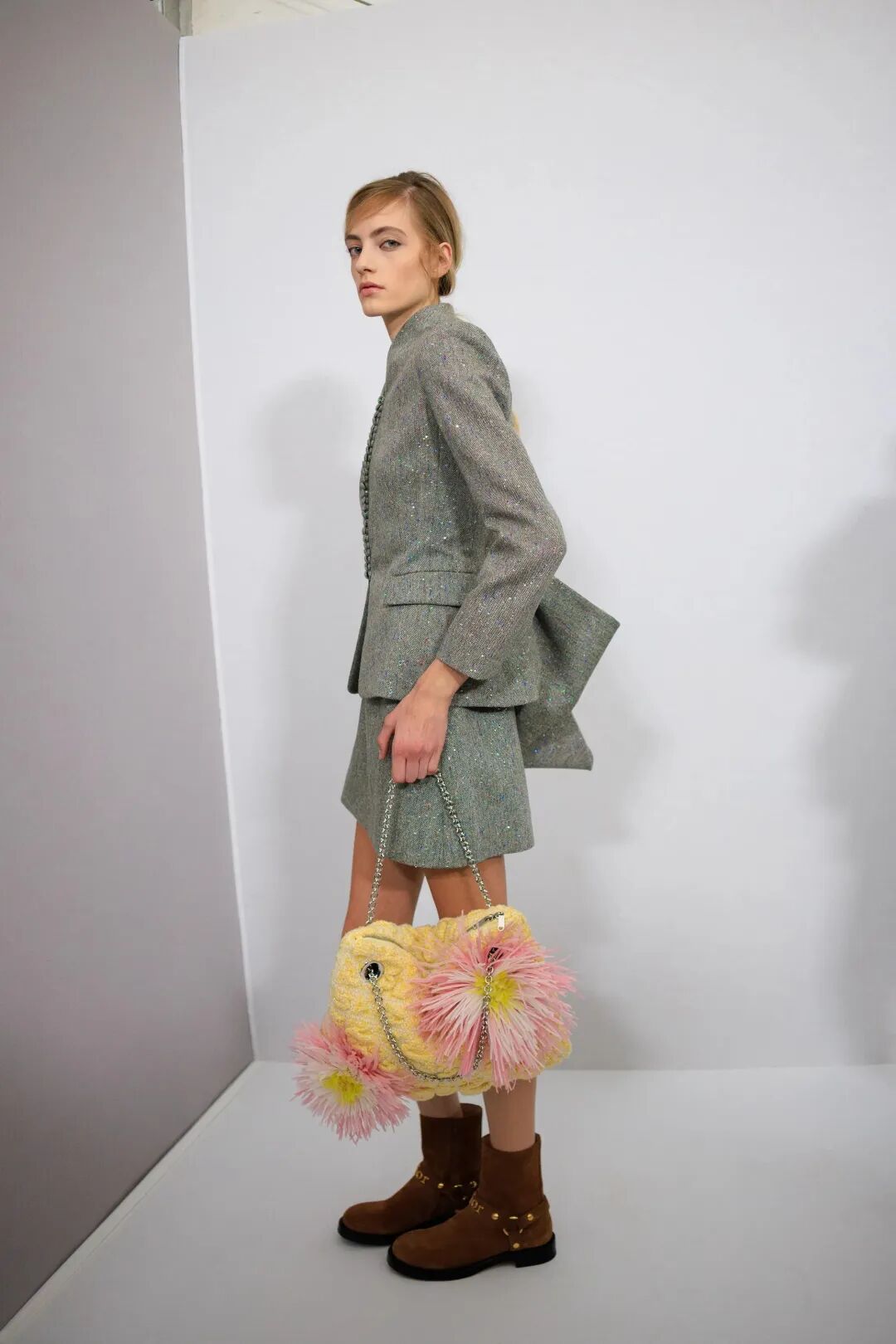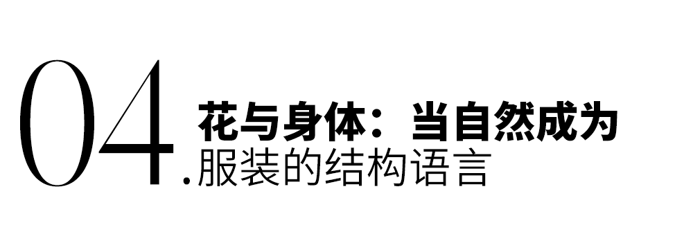 花朵几乎贯穿了整个系列,但它们并不是简单地以图案形式出现,而是逐渐渗入到结构、体量与轮廓之中,让衣服看起来像是从植物形态中慢慢生长出来。