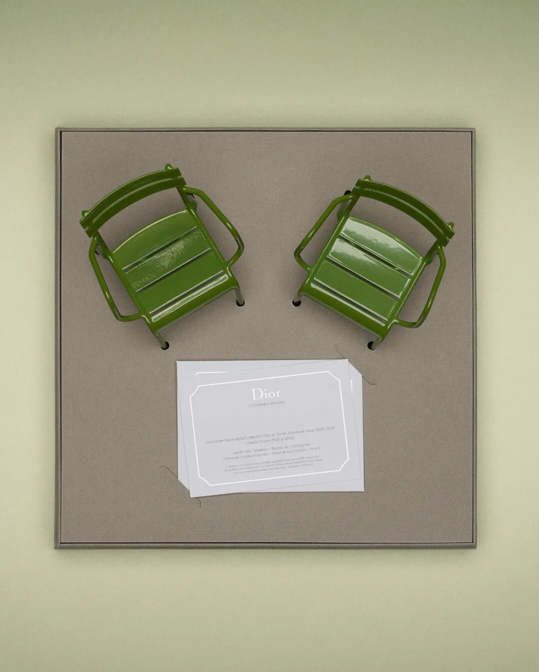 如果说杜乐丽花园为整场秀提供了历史与空间的背景,那么那把小小的绿色铁椅,则成为 Anderson 为这场 Dior 秀设置的第一个“线索”。这一季的邀请函并不是一张纸,而是两把迷你版杜乐丽花园铁椅。