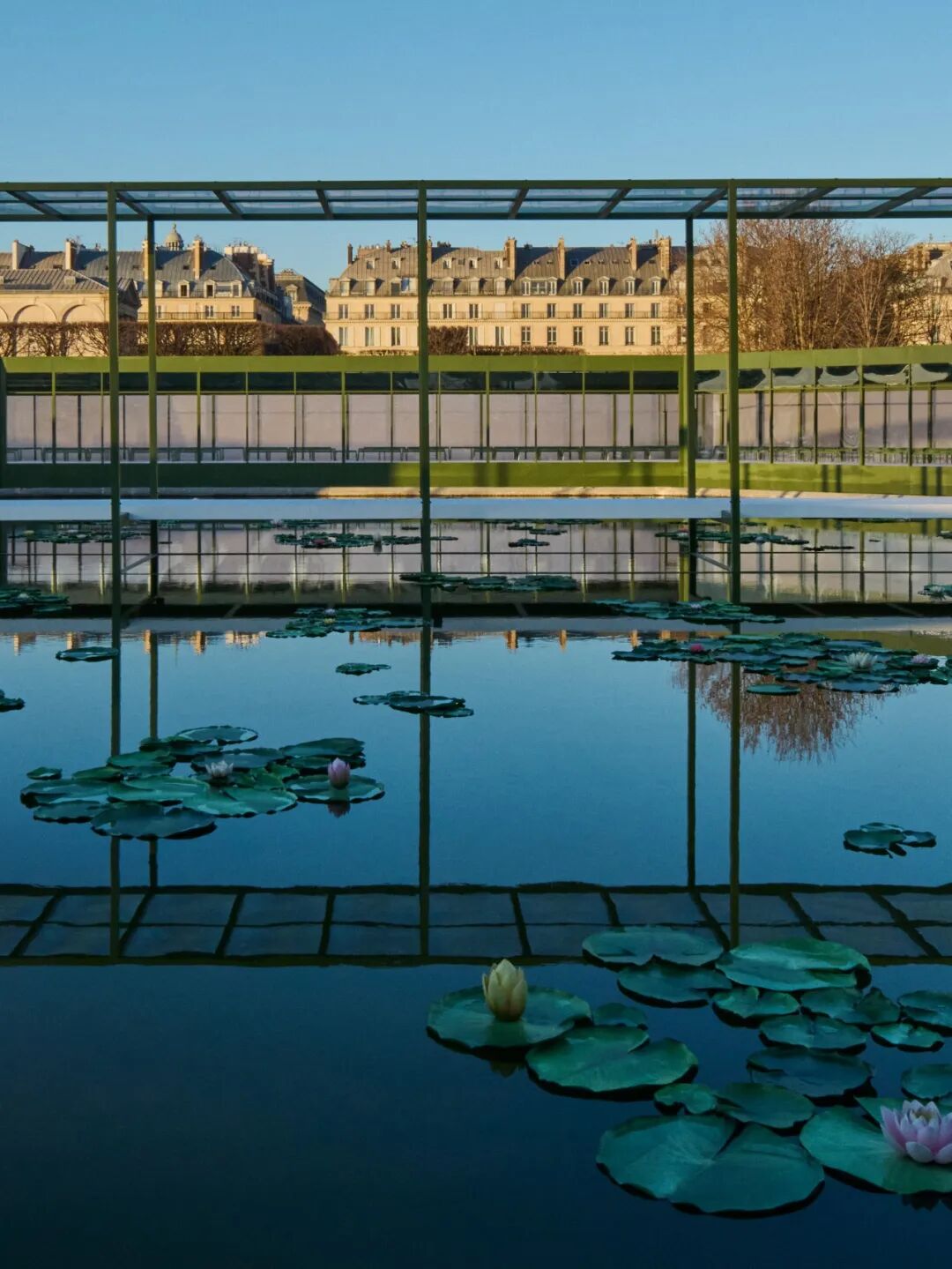 整条伸展台围绕着花园中央的 Bassin Octogonal 展开。这个八角形水池是杜乐丽花园最熟悉的地标之一,平静的水面上漂浮着人工放置的睡莲。远看几乎像莫奈画里的景象,但走近又能察觉到一点刻意的人工感。正是在这种微妙的张力之间,这场 Dior 秀找到了自己的视觉气氛:自然、装置、时装同时存在。
