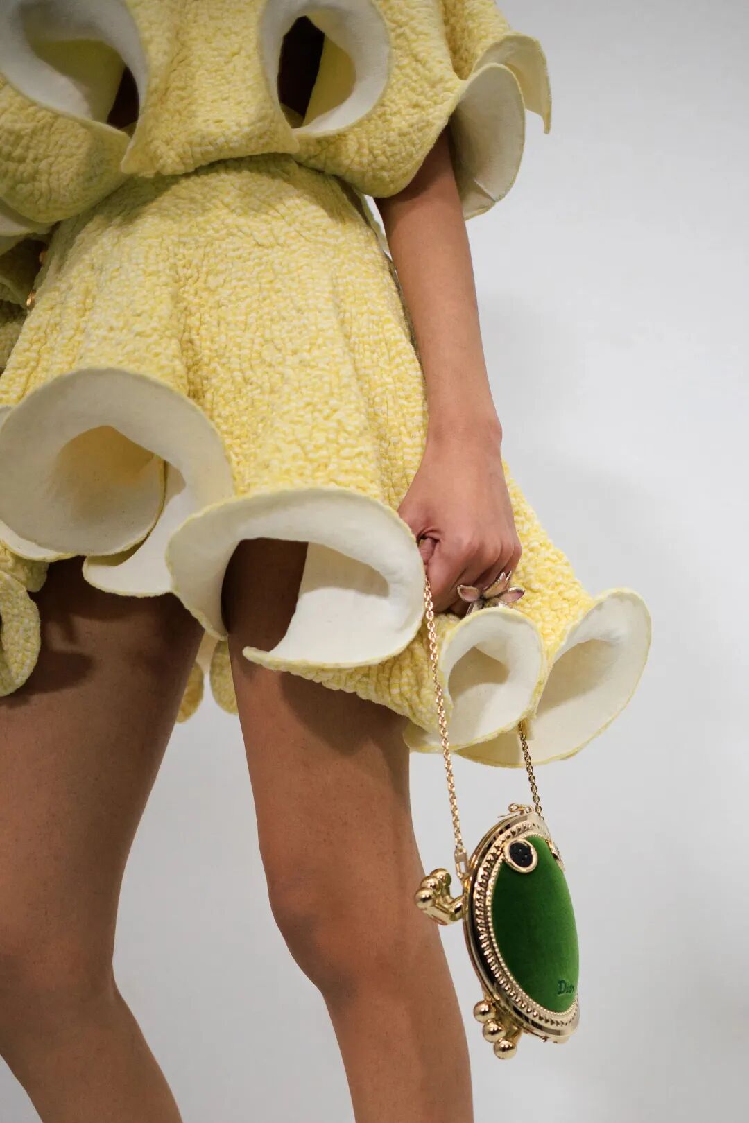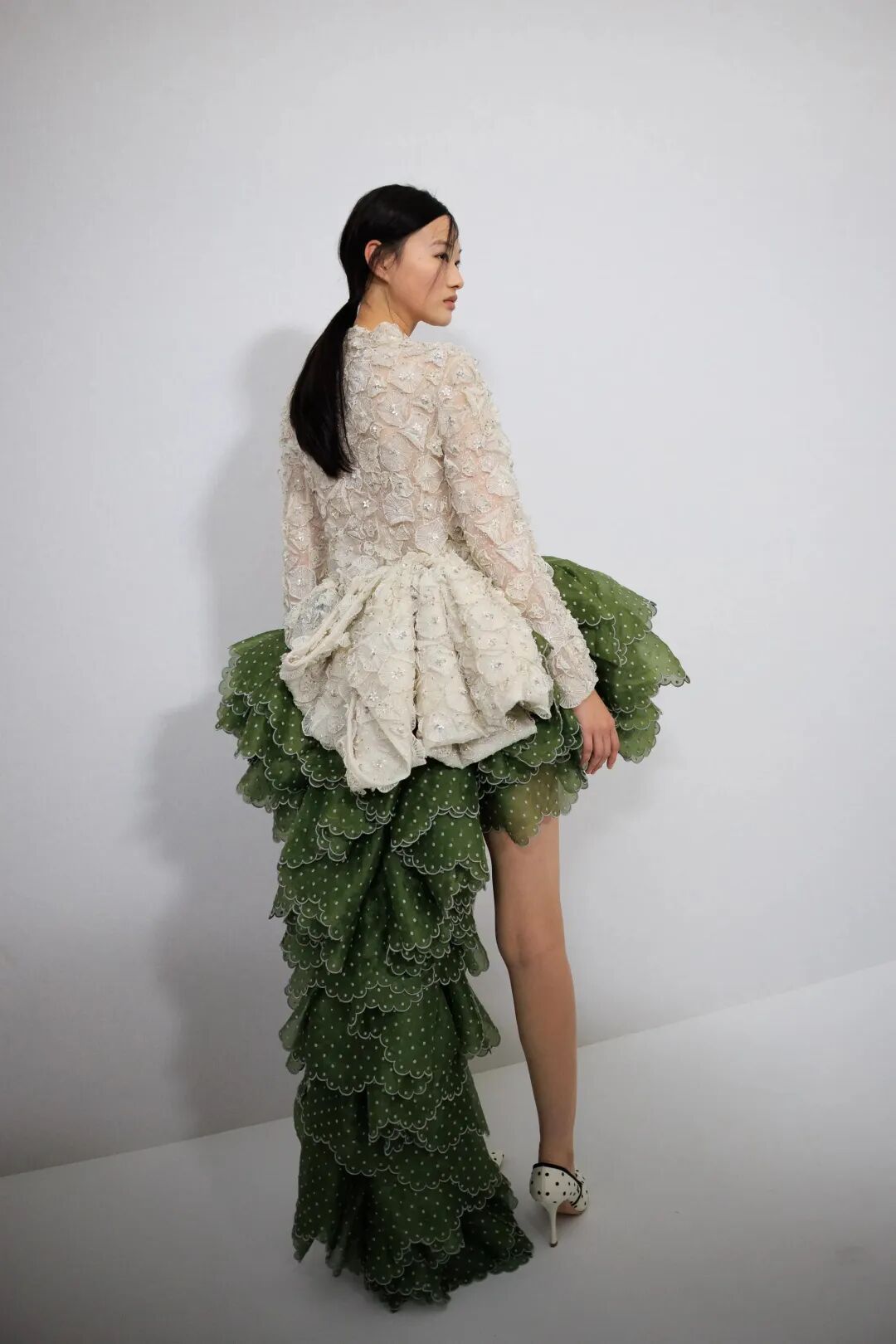 但 Anderson 的兴趣显然不止停留在装饰层面。花朵更重要的作用在于影响衣服的体量。某些短裙由层层叠叠的荷叶边组成,像花瓣一样向外展开,裙摆在后侧微微延伸,形成一种轻微拖曳的尾部。还有一些裙装体积在臀部或背部轻轻鼓起,隐约让人想到 19 世纪裙撑结构,但被处理得更加简洁、更加现代。