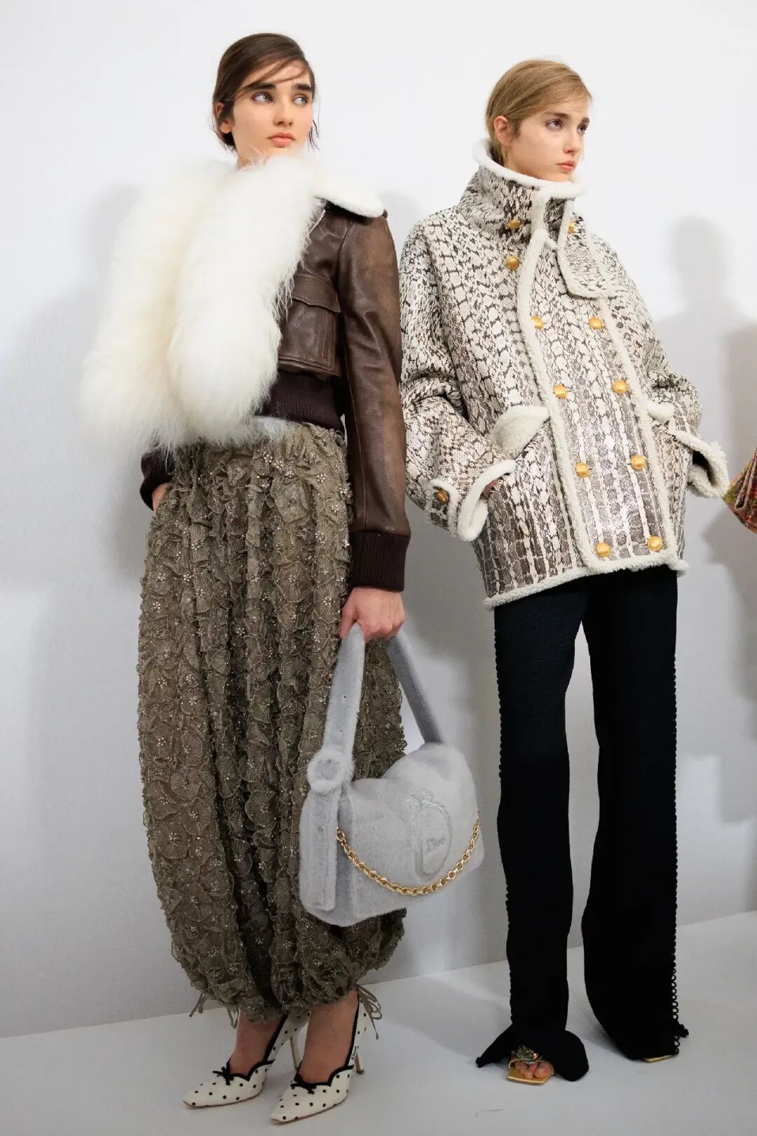 鞋履同样延续了这种介于季节之间的气氛。一些开放式凉鞋颜色鲜艳,看起来几乎属于春天;另一部分则是更为克制的绒面踝靴,为整体造型增加一点秋冬的重量感。这种组合让整个系列呈现出一种模糊的季节感——它名义上属于秋冬,却始终带着一点春天的气息。