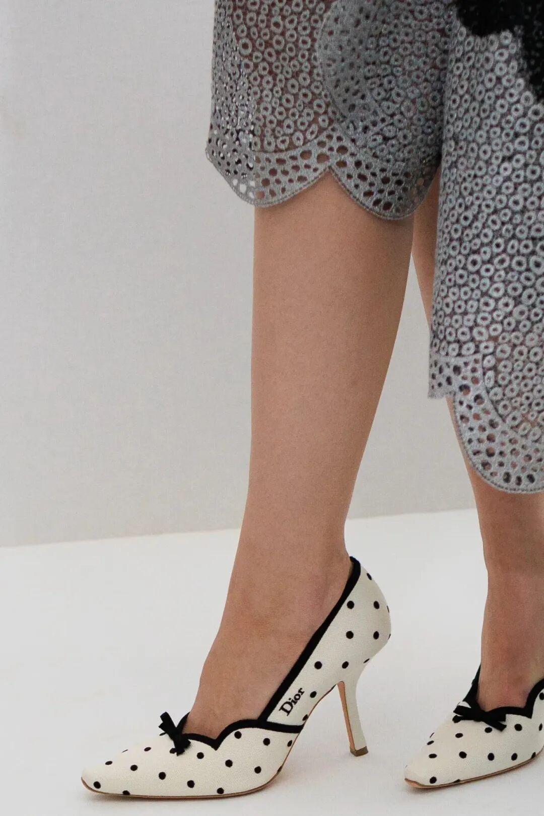 Dior 的经典 Bar Jacket 在这一季再次出现,并成为整个系列的结构核心。Anderson 并没有改变它最重要的特征——强调腰线的剪裁与略微扩展的下摆——但整体比例被重新调整:腰线略微提高,外套长度缩短,轮廓更加紧凑。与之搭配的裙装和短裤也保持一种圆润而集中的体量,使整个人的轮廓看起来像一枚缓慢绽放的花蕾。