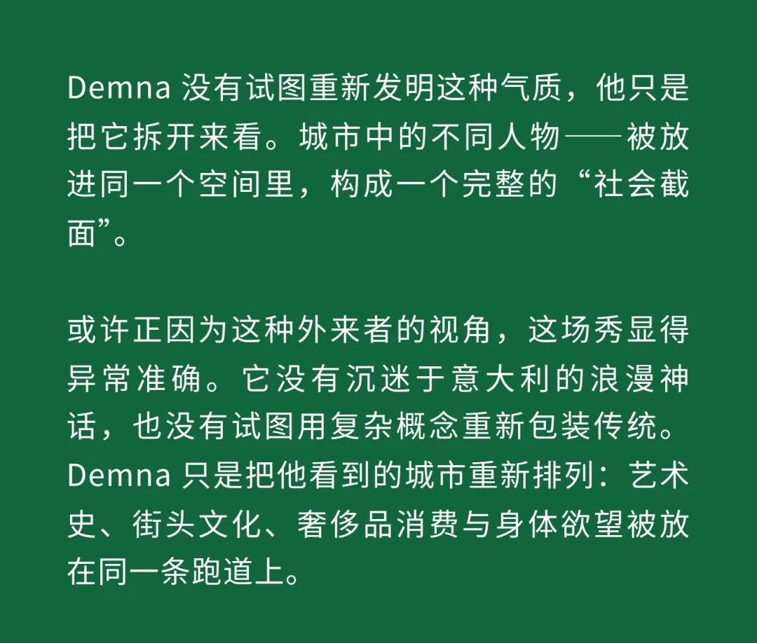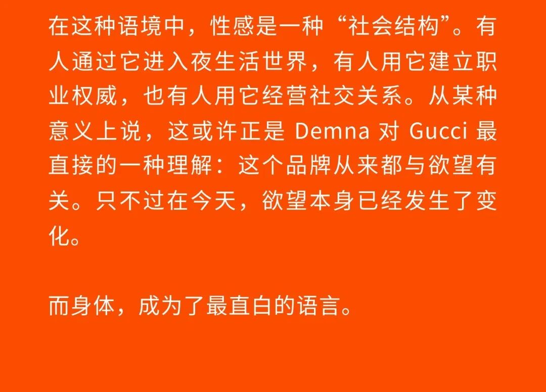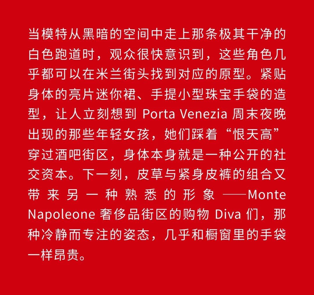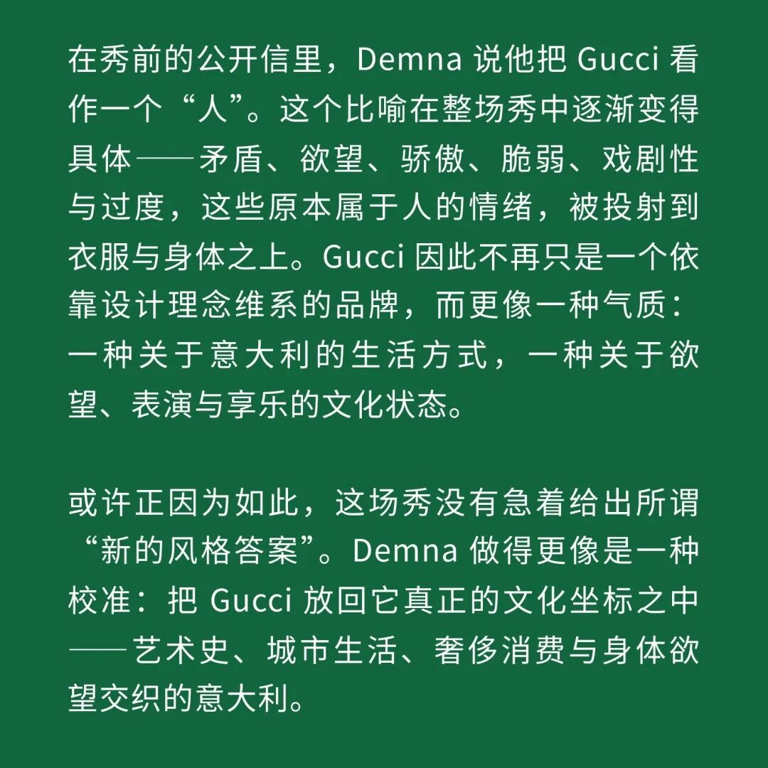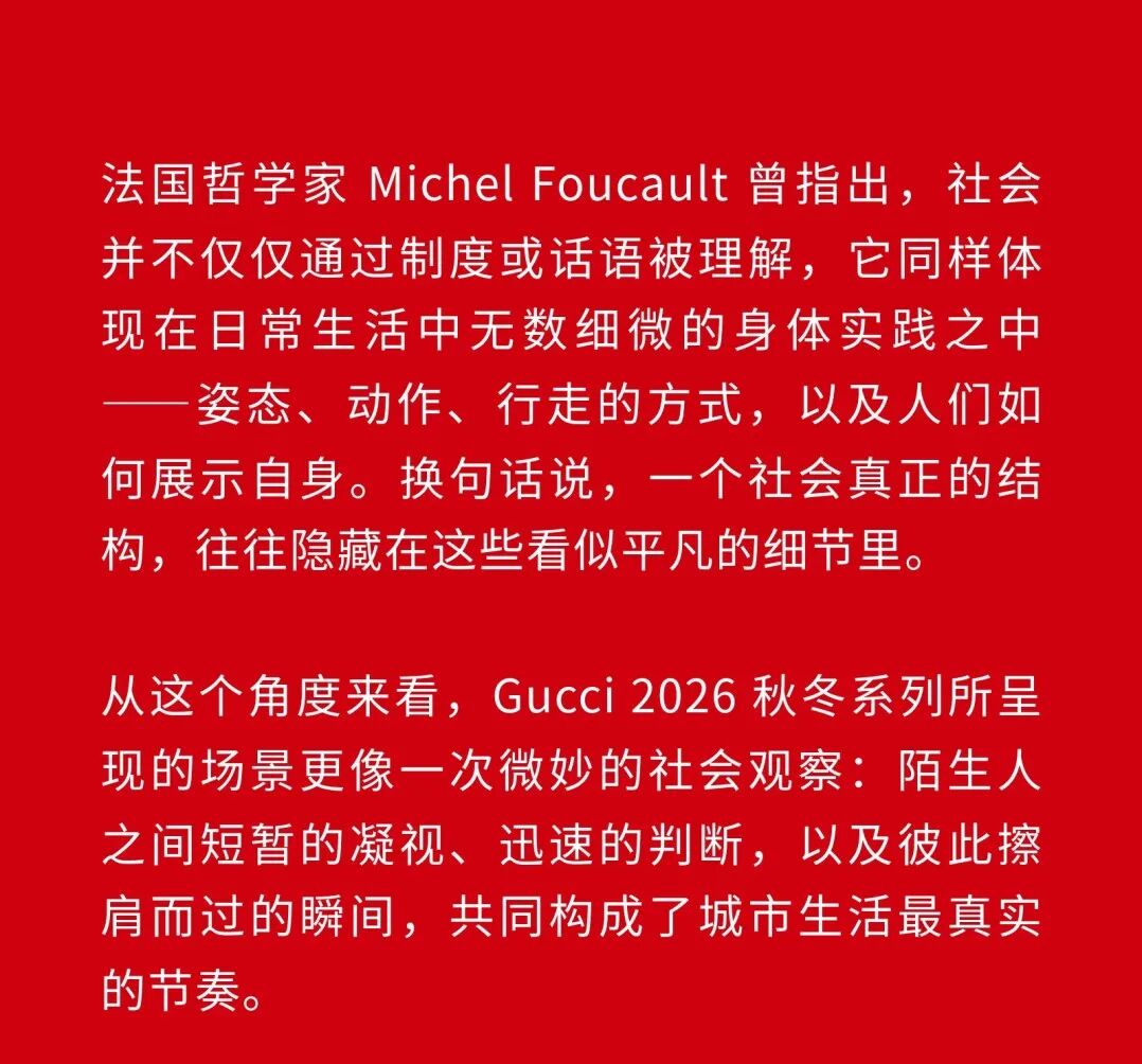 1、Demna 眼中的“城市人物学” 法国哲学家 Michel Foucault 曾指出,社会并不仅仅通过制度或话语被理解,它同样体现在日常生活中无数细微的身体实践之中——姿态、动作、行走的方式,以及人们如何展示自身。换句话说,一个社会真正的结构,往往隐藏在这些看似平凡的细节里。 从这个角度来看,Gucci 2026 秋冬系列所呈现的场景更像一次微妙的社会观察:陌生人之间短暂的凝视、迅速的判断,以及彼此擦肩而过的瞬间,共同构成了城市生活最真实的节奏。 当模特从黑暗的空间中走上那条极其干净的白色跑道时,观众很快意识到,这些角色几乎都可以在米兰街头找到对应的原型。紧贴身体的亮片迷你裙、手提小型珠宝手袋的造型,让人立刻想到 Porta Venezia 周末夜晚出现的那些年轻女孩,她们踩着“恨天高”穿过酒吧街区,身体本身就是一种公开的社交资本。下一刻,皮草与紧身皮裤的组合又带来另一种熟悉的形象——Monte Napoleone 奢侈品街区的购物 Diva 们,那种冷静而专注的姿态,几乎和橱窗里的手袋一样昂贵。 这种城市切片在秀场上不断变化。白色套装与蝴蝶结衬衫的出现让画面突然变得理性而克制,像是刚刚走出米兰商业区办公室的职业女性:也许是律师事务所的助理,也许是 CEO 的私人秘书。紧接着,轮廓又再次贴紧身体,肌肉线条被放大到近乎雕塑的程度,让人想到 Porta Nuova 那些高端健身俱乐部里的私人教练。 与此同时,夜晚的社交世界也被带进了这个空间。亮片裙、高跟鞋与过于招牌式的微笑,让某些角色看起来像是来自私人俱乐部卡座中的常客。接下来出现的则是另一类熟悉面孔:那些频繁出现在品牌活动与发布会上的时尚行业公关,他们的衣服看似随意却精心搭配,神情带着一种对这个行业过于熟悉的疲惫感。 而当一个穿着银色蛇纹裤和紧身 T 恤的年轻男孩出现时,秀场的坐标突然被拉向城市的另一端。意大利语有一个词来形容这种类型——Maranza。这个词通常指来自城市外围区域的年轻人,他们穿着张扬、姿态自信,同时又带着某种对精英文化的讽刺。 最终,整场秀在另一种熟悉的意大利女性形象中落幕:披着皮草披肩、长裙曳地的贵妇。她们的气质让人联想到科莫湖畔那些隐秘而华丽的别墅,亦或是 Luca Guadagnino 的电影《I Am Love》中 Tilda Swinton 饰演的 Emma——优雅、克制、表面冷静,却在沉默之中隐约透出一种对父权秩序的微妙抵抗 。 有趣的是,这种处理方式反而让整场秀显得异常坦率。Demna 并没有试图用复杂概念去掩饰欲望,也没有对这些女性的形象进行任何道德评判。夜生活女孩、办公室精英、购物女魔头——她们都以同样直接的方式出现在跑道上。不同的身体、不同的节奏与不同的社会位置被放置在同一个空间里,构成一种完整的城市生态。 从某个角度看,这几乎是一场以女性为核心的叙事。而这种不带审判的观看方式,让整场秀隐约带着一种对女性本身的欣赏与偏爱。 2、Demna 诠释的“新性感” Gucci 与性感之间的关系几乎已经成为品牌历史的一部分。三十年前,Tom Ford 用极端明确的方式重新定义了这个意大利品牌:低腰裤、几乎贴在皮肤上的丝质连衣裙、解开扣子的衬衫,以及那些大胆得近乎挑衅的广告影像。那一时期的 Gucci 性感带着一种高度风格化的夜生活气息——香槟、镜面、黑色大理石,以及略带颓废的派对文化。 Demna 显然清楚这段历史。秀场的结尾,当 Kate Moss 穿着一条露背礼服出现时,观众几乎立刻意识到那是一种明确的引用:背部完全敞开,腰窝与尾骨之间是一条镶嵌钻石的 GG 丁字裤。那一刻像是一个提醒——Gucci 从未真正离开过性感这个主题。但 Demna 所理解的性感,显然已经属于一个完全不同的时代。 今天的欲望结构早已改变。性感不再只存在于广告影像或夜生活文化之中,它已经渗透进日常生活的各个角落:健身房镜子前的自拍、社交媒体上经过计算的身体角度、付费订阅平台上的私人影像、甚至是那些阅后即焚的私密信息。在这种文化环境里,身体被不断展示、记录与交换,成为一种新的社会资本。 在这样的背景下,Demna 在这场秀里对轮廓的处理就显得格外清晰。过去十年,他几乎是 Oversized 美学最具代表性的设计师之一:宽大的肩线、拖地的裤子、模特脸上略显疲倦的冷漠表情,构成了一种带着反叛意味的反时尚姿态。而在这场 Gucci 秀里,这种比例关系突然被彻底改变。衣服被收紧到身体上,丝质针织连衣裙像液体一样包裹曲线,紧身背心紧贴肌肉线条,身体的结构被放大到几乎雕塑般清晰。 这种变化不仅是轮廓的改变,也是一种文化判断。秀场四周那些古典雕像像是在提供一个隐喻:石头里的身体与布料里的身体互相呼应。衣服在这里不再承担遮掩的功能,也不再提供距离感。它更像是一层包装,让身体本身成为视觉中心。 正因如此,这场秀的很多造型会让人产生一种奇怪的熟悉感。那些贴身针织、紧身裤装与曲线夸张的连衣裙,很容易让人联想到现实生活中的衣橱——Skims、leggings、或者各种专门为了展示身体线条而设计的服装。它们已经在城市中广泛存在,只是被 Demna 实实在在地放进了 Gucci 的语境之中。 在这种语境中,性感是一种“社会结构”。有人通过它进入夜生活世界,有人用它建立职业权威,也有人用它经营社交关系。从某种意义上说,这或许正是 Demna 对 Gucci 最直接的一种理解:这个品