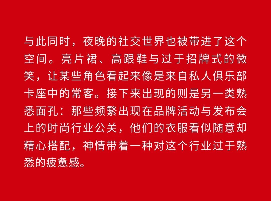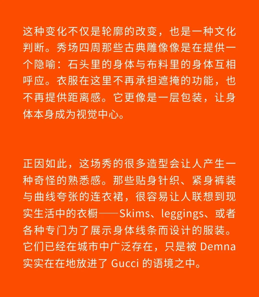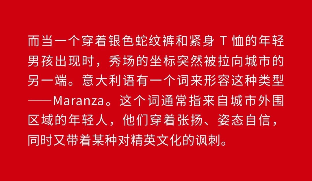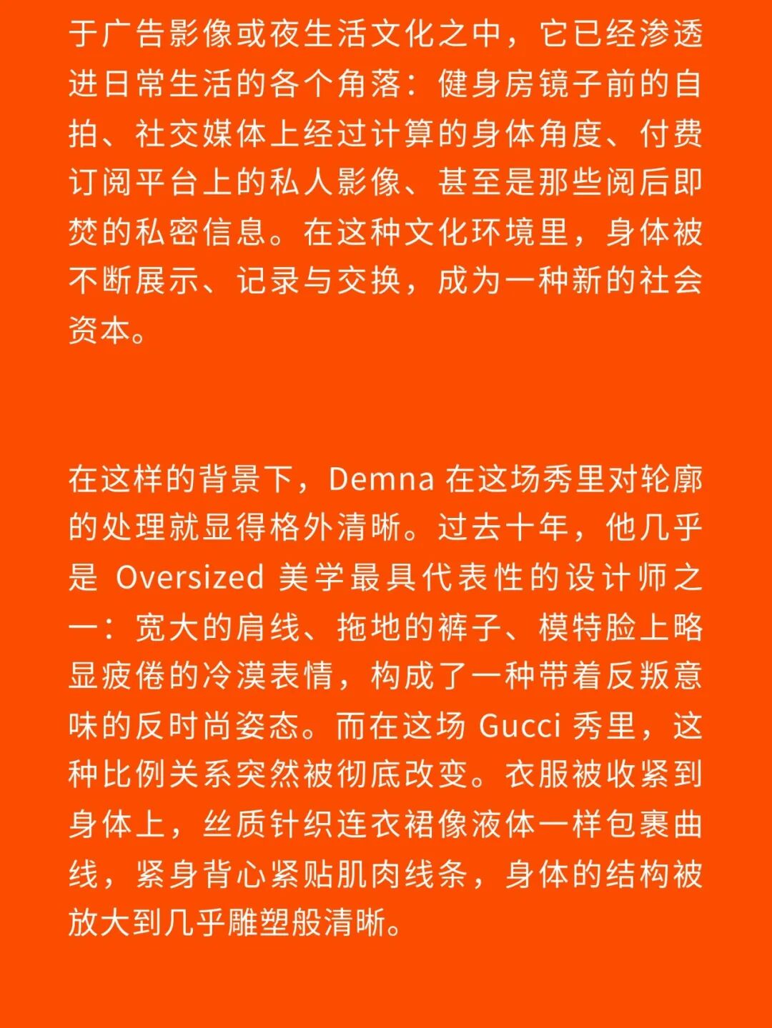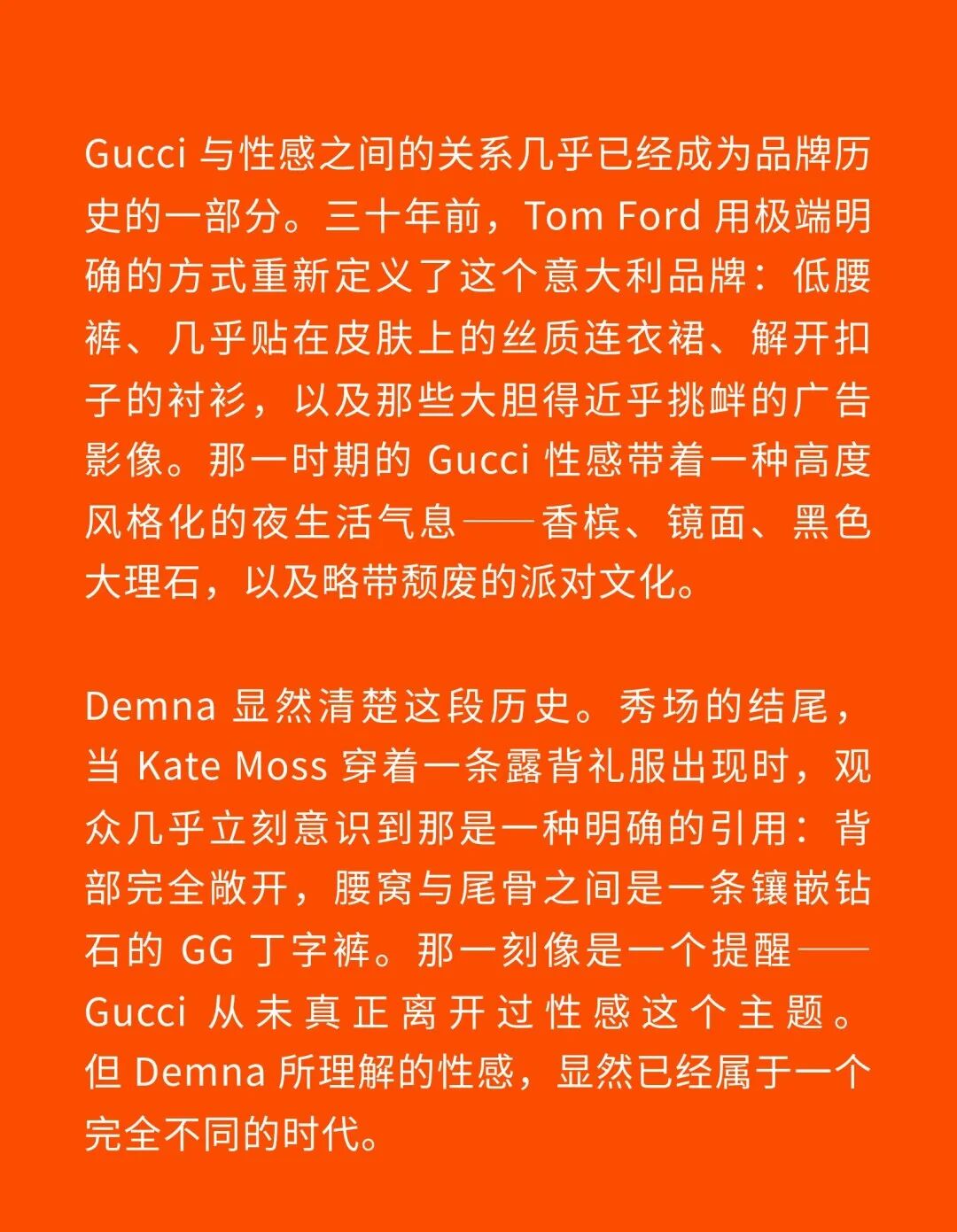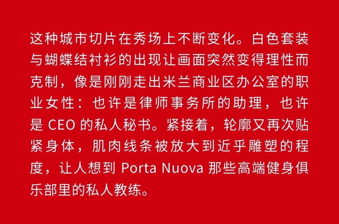 1、Demna 眼中的“城市人物学” 法国哲学家 Michel Foucault 曾指出,社会并不仅仅通过制度或话语被理解,它同样体现在日常生活中无数细微的身体实践之中——姿态、动作、行走的方式,以及人们如何展示自身。换句话说,一个社会真正的结构,往往隐藏在这些看似平凡的细节里。 从这个角度来看,Gucci 2026 秋冬系列所呈现的场景更像一次微妙的社会观察:陌生人之间短暂的凝视、迅速的判断,以及彼此擦肩而过的瞬间,共同构成了城市生活最真实的节奏。 当模特从黑暗的空间中走上那条极其干净的白色跑道时,观众很快意识到,这些角色几乎都可以在米兰街头找到对应的原型。紧贴身体的亮片迷你裙、手提小型珠宝手袋的造型,让人立刻想到 Porta Venezia 周末夜晚出现的那些年轻女孩,她们踩着“恨天高”穿过酒吧街区,身体本身就是一种公开的社交资本。下一刻,皮草与紧身皮裤的组合又带来另一种熟悉的形象——Monte Napoleone 奢侈品街区的购物 Diva 们,那种冷静而专注的姿态,几乎和橱窗里的手袋一样昂贵。 这种城市切片在秀场上不断变化。白色套装与蝴蝶结衬衫的出现让画面突然变得理性而克制,像是刚刚走出米兰商业区办公室的职业女性:也许是律师事务所的助理,也许是 CEO 的私人秘书。紧接着,轮廓又再次贴紧身体,肌肉线条被放大到近乎雕塑的程度,让人想到 Porta Nuova 那些高端健身俱乐部里的私人教练。 与此同时,夜晚的社交世界也被带进了这个空间。亮片裙、高跟鞋与过于招牌式的微笑,让某些角色看起来像是来自私人俱乐部卡座中的常客。接下来出现的则是另一类熟悉面孔:那些频繁出现在品牌活动与发布会上的时尚行业公关,他们的衣服看似随意却精心搭配,神情带着一种对这个行业过于熟悉的疲惫感。 而当一个穿着银色蛇纹裤和紧身 T 恤的年轻男孩出现时,秀场的坐标突然被拉向城市的另一端。意大利语有一个词来形容这种类型——Maranza。这个词通常指来自城市外围区域的年轻人,他们穿着张扬、姿态自信,同时又带着某种对精英文化的讽刺。 最终,整场秀在另一种熟悉的意大利女性形象中落幕:披着皮草披肩、长裙曳地的贵妇。她们的气质让人联想到科莫湖畔那些隐秘而华丽的别墅,亦或是 Luca Guadagnino 的电影《I Am Love》中 Tilda Swinton 饰演的 Emma——优雅、克制、表面冷静,却在沉默之中隐约透出一种对父权秩序的微妙抵抗 。 有趣的是,这种处理方式反而让整场秀显得异常坦率。Demna 并没有试图用复杂概念去掩饰欲望,也没有对这些女性的形象进行任何道德评判。夜生活女孩、办公室精英、购物女魔头——她们都以同样直接的方式出现在跑道上。不同的身体、不同的节奏与不同的社会位置被放置在同一个空间里,构成一种完整的城市生态。 从某个角度看,这几乎是一场以女性为核心的叙事。而这种不带审判的观看方式,让整场秀隐约带着一种对女性本身的欣赏与偏爱。 2、Demna 诠释的“新性感” Gucci 与性感之间的关系几乎已经成为品牌历史的一部分。三十年前,Tom Ford 用极端明确的方式重新定义了这个意大利品牌:低腰裤、几乎贴在皮肤上的丝质连衣裙、解开扣子的衬衫,以及那些大胆得近乎挑衅的广告影像。那一时期的 Gucci 性感带着一种高度风格化的夜生活气息——香槟、镜面、黑色大理石,以及略带颓废的派对文化。 Demna 显然清楚这段历史。秀场的结尾,当 Kate Moss 穿着一条露背礼服出现时,观众几乎立刻意识到那是一种明确的引用:背部完全敞开,腰窝与尾骨之间是一条镶嵌钻石的 GG 丁字裤。那一刻像是一个提醒——Gucci 从未真正离开过性感这个主题。但 Demna 所理解的性感,显然已经属于一个完全不同的时代。 今天的欲望结构早已改变。性感不再只存在于广告影像或夜生活文化之中,它已经渗透进日常生活的各个角落:健身房镜子前的自拍、社交媒体上经过计算的身体角度、付费订阅平台上的私人影像、甚至是那些阅后即焚的私密信息。在这种文化环境里,身体被不断展示、记录与交换,成为一种新的社会资本。 在这样的背景下,Demna 在这场秀里对轮廓的处理就显得格外清晰。过去十年,他几乎是 Oversized 美学最具代表性的设计师之一:宽大的肩线、拖地的裤子、模特脸上略显疲倦的冷漠表情,构成了一种带着反叛意味的反时尚姿态。而在这场 Gucci 秀里,这种比例关系突然被彻底改变。衣服被收紧到身体上,丝质针织连衣裙像液体一样包裹曲线,紧身背心紧贴肌肉线条,身体的结构被放大到几乎雕塑般清晰。 这种变化不仅是轮廓的改变,也是一种文化判断。秀场四周那些古典雕像像是在提供一个隐喻:石头里的身体与布料里的身体互相呼应。衣服在这里不再承担遮掩的功能,也不再提供距离感。它更像是一层包装,让身体本身成为视觉中心。 正因如此,这场秀的很多造型会让人产生一种奇怪的熟悉感。那些贴身针织、紧身裤装与曲线夸张的连衣裙,很容易让人联想到现实生活中的衣橱——Skims、leggings、或者各种专门为了展示身体线条而设计的服装。它们已经在城市中广泛存在,只是被 Demna 实实在在地放进了 Gucci 的语境之中。 在这种语境中,性感是一种“社会结构”。有人通过它进入夜生活世界,有人用它建立职业权威,也有人用它经营社交关系。从某种意义上说,这或许正是 Demna 对 Gucci 最直接的一种理解:这个品