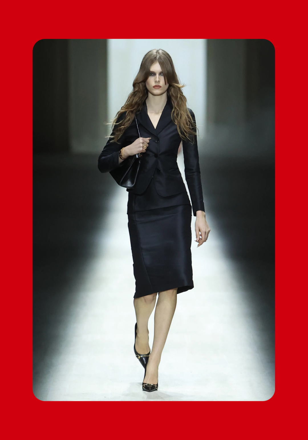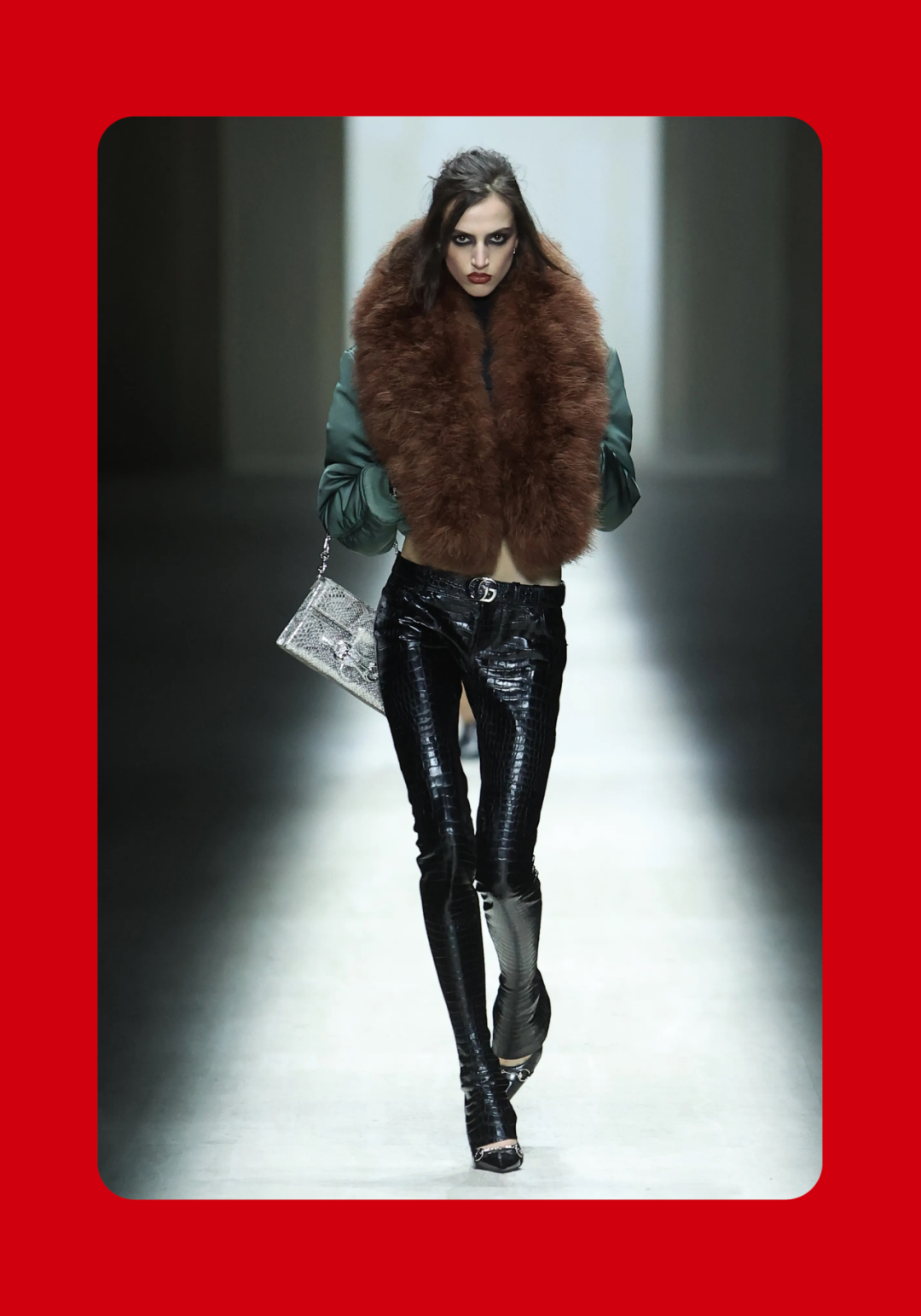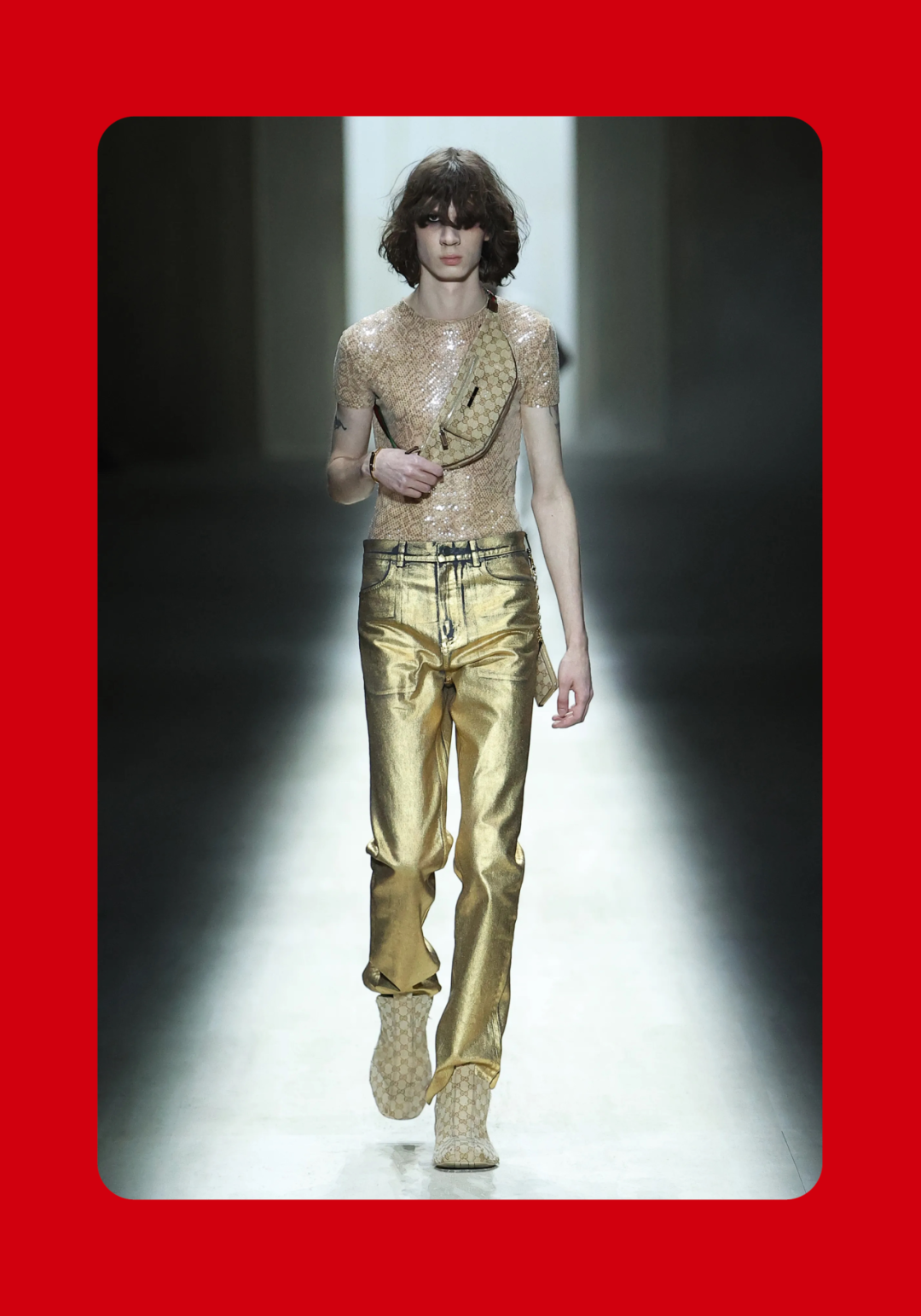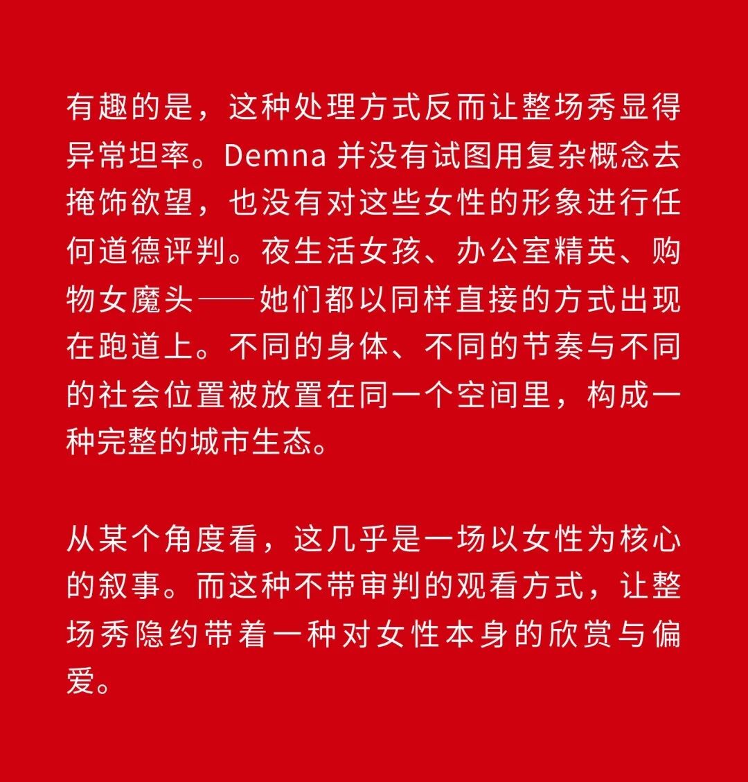 1、Demna 眼中的“城市人物学” 法国哲学家 Michel Foucault 曾指出,社会并不仅仅通过制度或话语被理解,它同样体现在日常生活中无数细微的身体实践之中——姿态、动作、行走的方式,以及人们如何展示自身。换句话说,一个社会真正的结构,往往隐藏在这些看似平凡的细节里。 从这个角度来看,Gucci 2026 秋冬系列所呈现的场景更像一次微妙的社会观察:陌生人之间短暂的凝视、迅速的判断,以及彼此擦肩而过的瞬间,共同构成了城市生活最真实的节奏。 当模特从黑暗的空间中走上那条极其干净的白色跑道时,观众很快意识到,这些角色几乎都可以在米兰街头找到对应的原型。紧贴身体的亮片迷你裙、手提小型珠宝手袋的造型,让人立刻想到 Porta Venezia 周末夜晚出现的那些年轻女孩,她们踩着“恨天高”穿过酒吧街区,身体本身就是一种公开的社交资本。下一刻,皮草与紧身皮裤的组合又带来另一种熟悉的形象——Monte Napoleone 奢侈品街区的购物 Diva 们,那种冷静而专注的姿态,几乎和橱窗里的手袋一样昂贵。 这种城市切片在秀场上不断变化。白色套装与蝴蝶结衬衫的出现让画面突然变得理性而克制,像是刚刚走出米兰商业区办公室的职业女性:也许是律师事务所的助理,也许是 CEO 的私人秘书。紧接着,轮廓又再次贴紧身体,肌肉线条被放大到近乎雕塑的程度,让人想到 Porta Nuova 那些高端健身俱乐部里的私人教练。 与此同时,夜晚的社交世界也被带进了这个空间。亮片裙、高跟鞋与过于招牌式的微笑,让某些角色看起来像是来自私人俱乐部卡座中的常客。接下来出现的则是另一类熟悉面孔:那些频繁出现在品牌活动与发布会上的时尚行业公关,他们的衣服看似随意却精心搭配,神情带着一种对这个行业过于熟悉的疲惫感。 而当一个穿着银色蛇纹裤和紧身 T 恤的年轻男孩出现时,秀场的坐标突然被拉向城市的另一端。意大利语有一个词来形容这种类型——Maranza。这个词通常指来自城市外围区域的年轻人,他们穿着张扬、姿态自信,同时又带着某种对精英文化的讽刺。 最终,整场秀在另一种熟悉的意大利女性形象中落幕:披着皮草披肩、长裙曳地的贵妇。她们的气质让人联想到科莫湖畔那些隐秘而华丽的别墅,亦或是 Luca Guadagnino 的电影《I Am Love》中 Tilda Swinton 饰演的 Emma——优雅、克制、表面冷静,却在沉默之中隐约透出一种对父权秩序的微妙抵抗 。 有趣的是,这种处理方式反而让整场秀显得异常坦率。Demna 并没有试图用复杂概念去掩饰欲望,也没有对这些女性的形象进行任何道德评判。夜生活女孩、办公室精英、购物女魔头——她们都以同样直接的方式出现在跑道上。不同的身体、不同的节奏与不同的社会位置被放置在同一个空间里,构成一种完整的城市生态。 从某个角度看,这几乎是一场以女性为核心的叙事。而这种不带审判的观看方式,让整场秀隐约带着一种对女性本身的欣赏与偏爱。 2、Demna 诠释的“新性感” Gucci 与性感之间的关系几乎已经成为品牌历史的一部分。三十年前,Tom Ford 用极端明确的方式重新定义了这个意大利品牌:低腰裤、几乎贴在皮肤上的丝质连衣裙、解开扣子的衬衫,以及那些大胆得近乎挑衅的广告影像。那一时期的 Gucci 性感带着一种高度风格化的夜生活气息——香槟、镜面、黑色大理石,以及略带颓废的派对文化。 Demna 显然清楚这段历史。秀场的结尾,当 Kate Moss 穿着一条露背礼服出现时,观众几乎立刻意识到那是一种明确的引用:背部完全敞开,腰窝与尾骨之间是一条镶嵌钻石的 GG 丁字裤。那一刻像是一个提醒——Gucci 从未真正离开过性感这个主题。但 Demna 所理解的性感,显然已经属于一个完全不同的时代。 今天的欲望结构早已改变。性感不再只存在于广告影像或夜生活文化之中,它已经渗透进日常生活的各个角落:健身房镜子前的自拍、社交媒体上经过计算的身体角度、付费订阅平台上的私人影像、甚至是那些阅后即焚的私密信息。在这种文化环境里,身体被不断展示、记录与交换,成为一种新的社会资本。 在这样的背景下,Demna 在这场秀里对轮廓的处理就显得格外清晰。过去十年,他几乎是 Oversized 美学最具代表性的设计师之一:宽大的肩线、拖地的裤子、模特脸上略显疲倦的冷漠表情,构成了一种带着反叛意味的反时尚姿态。而在这场 Gucci 秀里,这种比例关系突然被彻底改变。衣服被收紧到身体上,丝质针织连衣裙像液体一样包裹曲线,紧身背心紧贴肌肉线条,身体的结构被放大到几乎雕塑般清晰。 这种变化不仅是轮廓的改变,也是一种文化判断。秀场四周那些古典雕像像是在提供一个隐喻:石头里的身体与布料里的身体互相呼应。衣服在这里不再承担遮掩的功能,也不再提供距离感。它更像是一层包装,让身体本身成为视觉中心。 正因如此,这场秀的很多造型会让人产生一种奇怪的熟悉感。那些贴身针织、紧身裤装与曲线夸张的连衣裙,很容易让人联想到现实生活中的衣橱——Skims、leggings、或者各种专门为了展示身体线条而设计的服装。它们已经在城市中广泛存在,只是被 Demna 实实在在地放进了 Gucci 的语境之中。 在这种语境中,性感是一种“社会结构”。有人通过它进入夜生活世界,有人用它建立职业权威,也有人用它经营社交关系。从某种意义上说,这或许正是 Demna 对 Gucci 最直接的一种理解:这个品