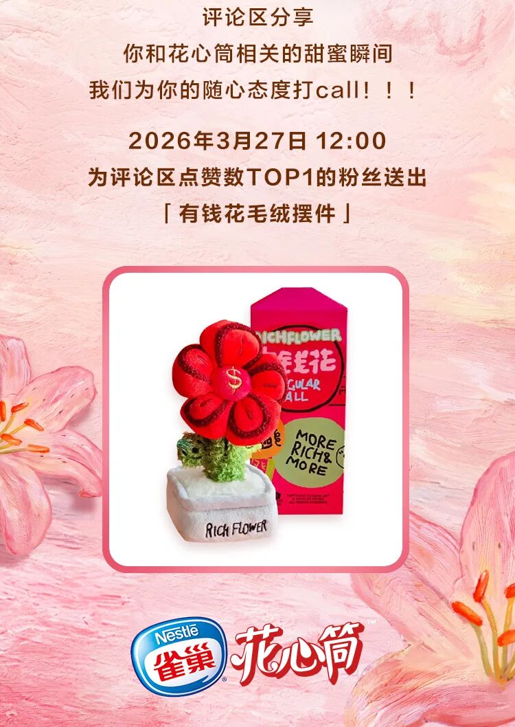 兑奖条件:点赞+转发+在看;评论区分享你和花心筒相关的甜蜜瞬间,抽取点赞最高的1名粉丝