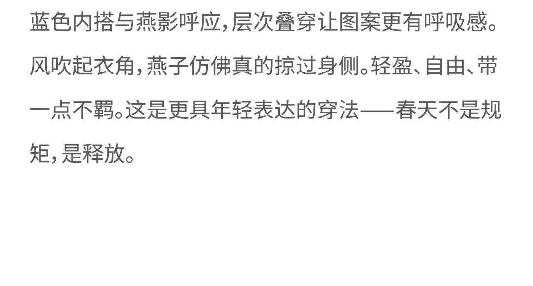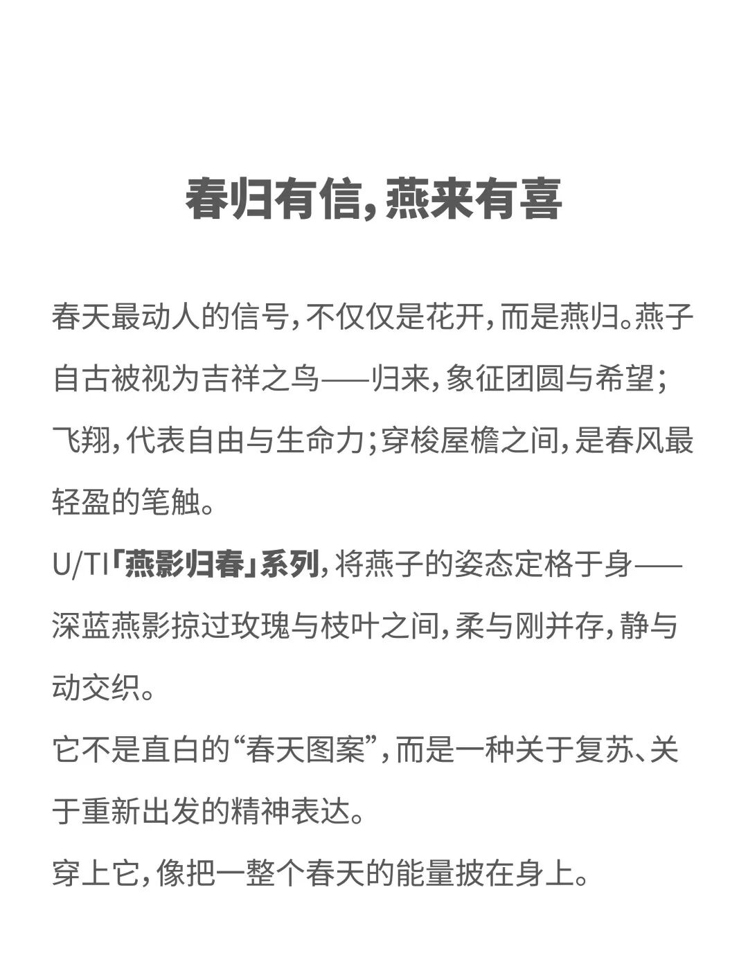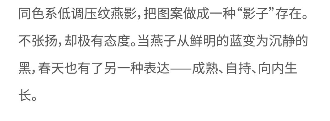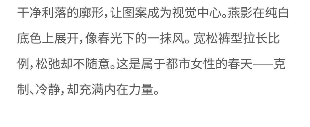 摘要:U/TI以“春燕”为灵感,将吉祥与生命力,化作日常穿搭的力量。