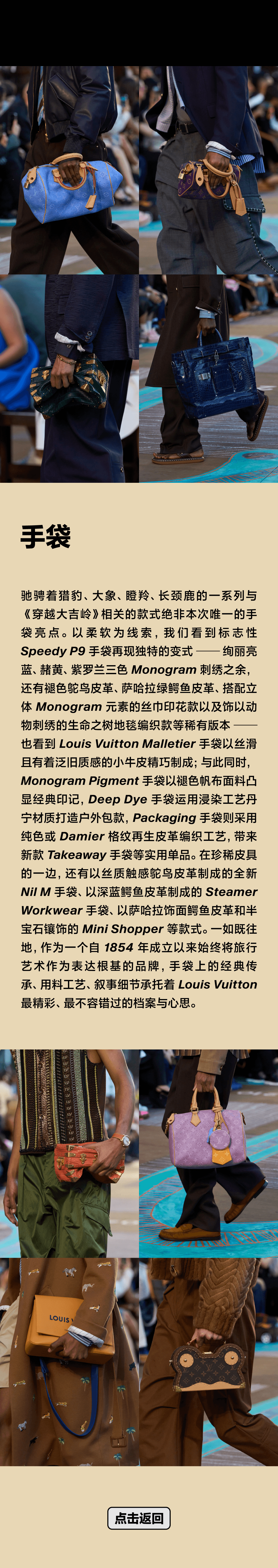 - 驰骋着猎豹、大象、瞪羚、长颈鹿的一系列与《穿越大吉岭》相关的款式绝非本次唯一的手袋亮点。以柔软为线索,我们看到标志性 Speedy P9 手袋再现独特的变式——绚丽亮蓝、赭黄、紫罗兰三色 Monogram 刺绣之余,还有褪色鸵鸟皮革、萨哈拉绿鳄鱼皮革、搭配立体 Monogram 元素的丝巾印花款以及饰以动物刺绣的生命之树地毯编织款等稀有版本——也看到 Louis Vuitton Malletier 手袋以丝滑且有着泛旧质感的小牛皮精巧制成;与此同时,Monogram Pigment 手袋以褪色帆布面料凸显经典印记,Deep Dye 手袋运用浸染工艺丹宁材质打造户外包款,Packaging 手袋则采用纯色或 Damier 格纹再生皮革编织工艺,带来新款 Takeaway 手袋等实用单品。在珍稀皮具的一边,还有以丝质触感鸵鸟皮革制成的全新 Nil M 手袋、以深蓝鳄鱼皮革制成的 Steamer Workwear 手袋、以萨哈拉饰面鳄鱼皮革和半宝石镶饰的 Mini Shopper 等款式。一如既往地,作为一个自 1854 年成立以来始终将旅行艺术作为表达根基的品牌,手袋上的经典传承、用料工艺、叙事细节承托着 Louis Vuitton 最精彩、最不容错过的档案与心思。