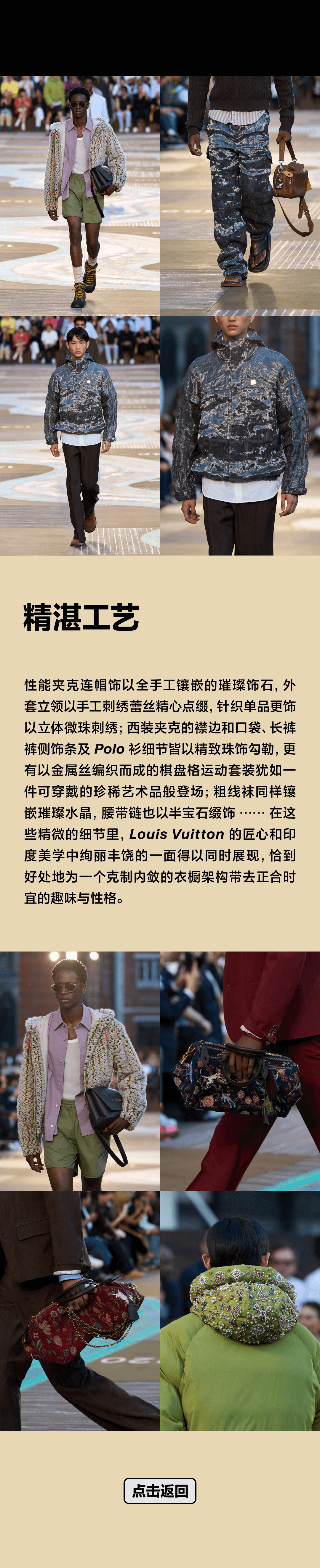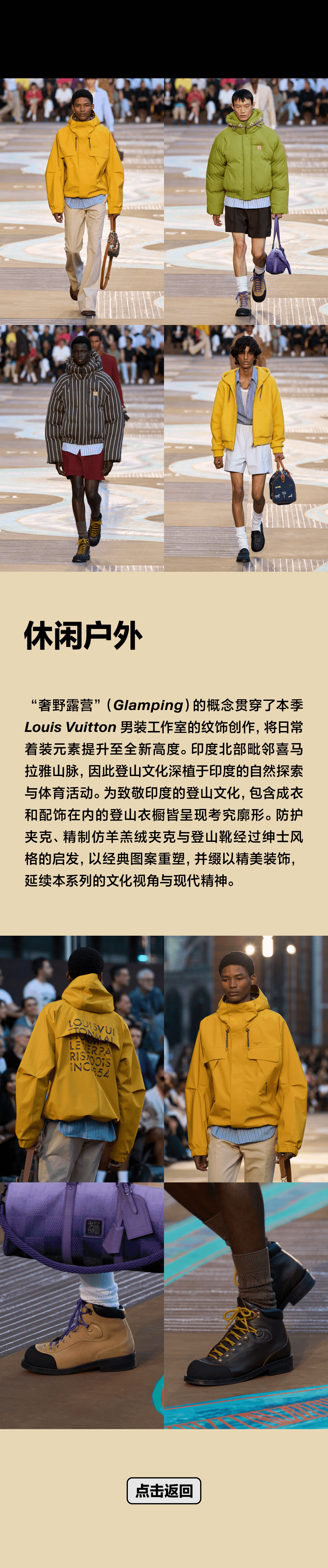 - 「奢野露营」(Glamping)的概念贯穿了本季 Louis Vuitton 男装工作室的纹饰创作,将日常着装元素提升至全新高度。印度北部毗邻喜马拉雅山脉,因此登山文化深植于印度的自然探索与体育活动。为致敬印度的登山文化,包含成衣和配饰在内的登山衣橱皆呈现考究廓形。防护夹克、精制仿羊羔绒夹克与登山靴经过绅士风格的启发,以经典图案重塑,并缀以精美装饰,延续本系列的文化视角与现代精神。