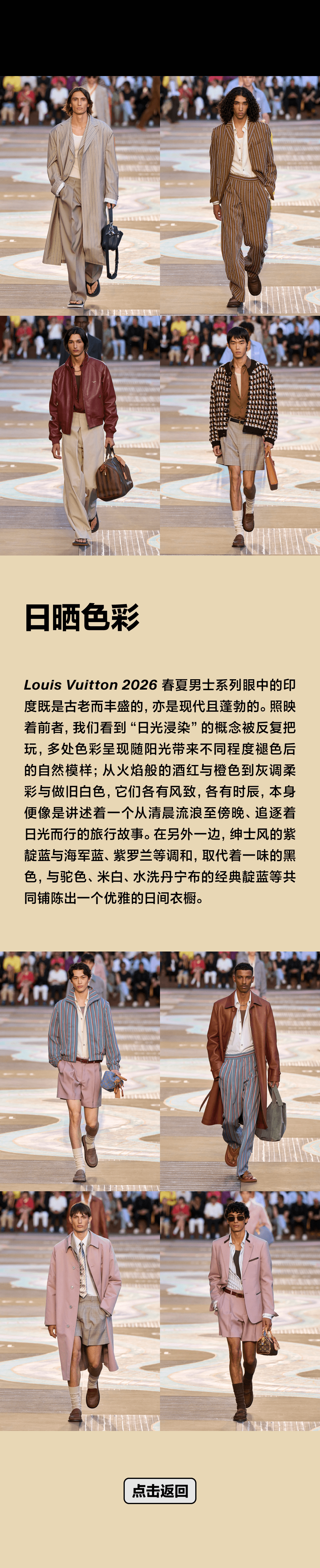 Louis Vuitton 2026 春夏男装在这样的环境中,少了些舞台的喧哗,多了种“在路上”的呼吸感。色彩被日光浸过,原生肌理被保留,只用“行走”就写出了自由、随性的氛围感。