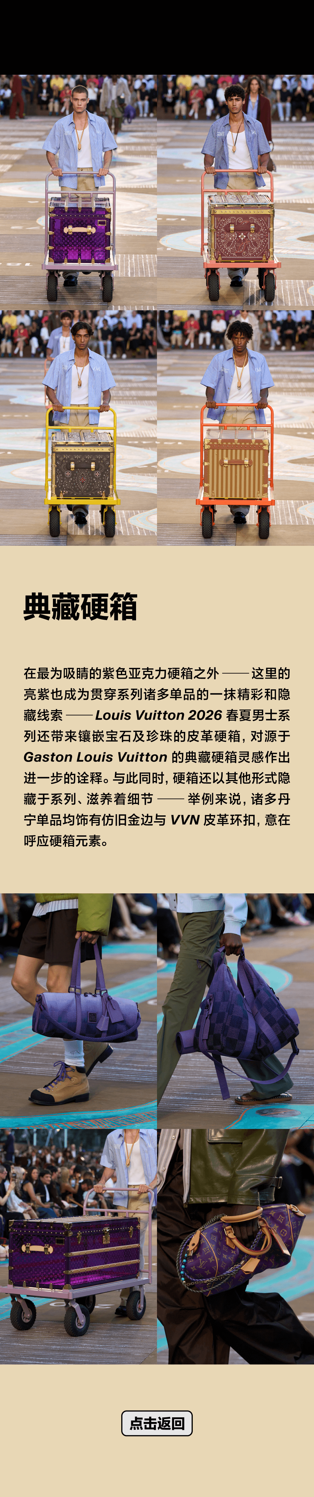 - 在最为吸睛的紫色亚克力硬箱之外——这里的亮紫也成为贯穿系列诸多单品的一抹精彩和隐藏线索——Louis Vuitton 2026 春夏男士系列还带来镶嵌宝石及珍珠的皮革硬箱,对源于 Gaston Louis Vuitton 的典藏硬箱灵感作出进一步的诠释。与此同时,硬箱还以其他形式隐藏于系列、滋养着细节——举例来说,诸多丹宁单品均饰有仿旧金边与 VVN 皮革环扣,意在呼应硬箱元素。