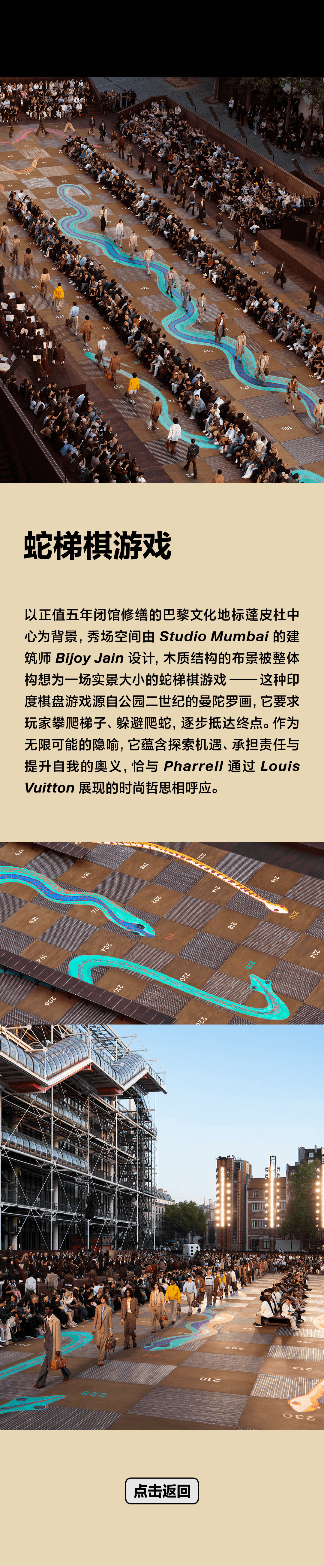 - 以正值五年闭馆修缮的巴黎文化地标蓬皮杜中心为背景,秀场空间由 Studio Mumbai 的建筑师 Bijoy Jain 设计,木质结构的布景被整体构想为一场实景大小的蛇梯棋游戏——这种印度棋盘游戏源自公园二世纪的曼陀罗画,它要求玩家攀爬梯子、躲避爬蛇,逐步抵达终点。作为无限可能的隐喻,它蕴含探索机遇、承担责任与提升自我的奥义,恰与 Pharrell 通过 Louis Vuitton 展现的时尚哲思相呼应。