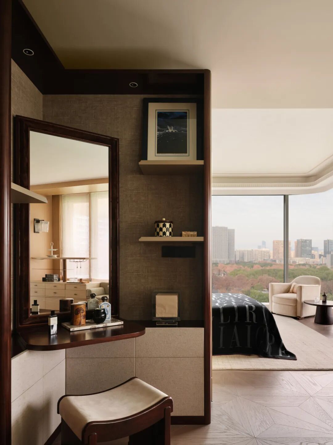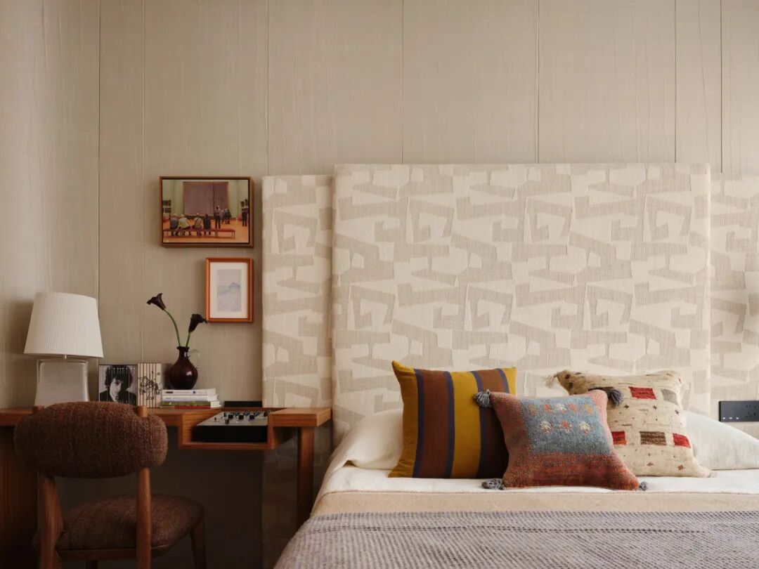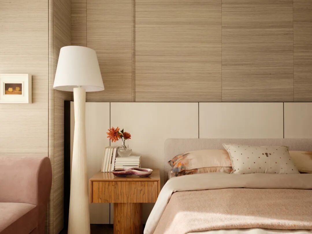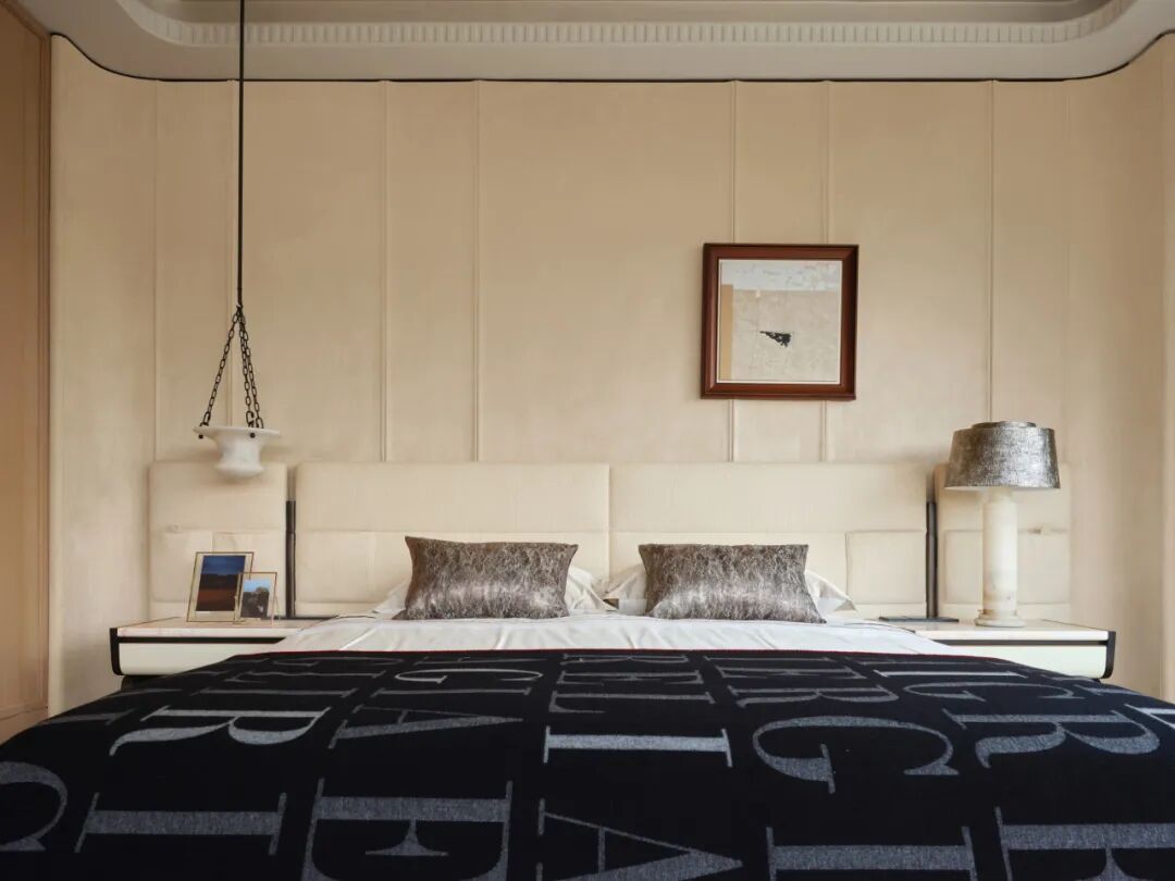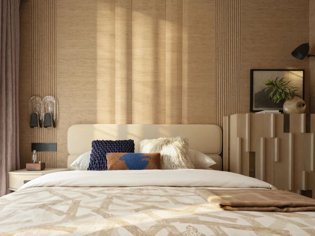 主卧套间以奢阔的开间与进深,实现了酒店式功能的精细化升级,让精英的私密生活兼具舒适度与精神质感。主次卧色调以温润的米灰色为主,选用触感柔和的棉麻织物与实木家具,保留轻办公、梳妆、休闲区等多功能性。