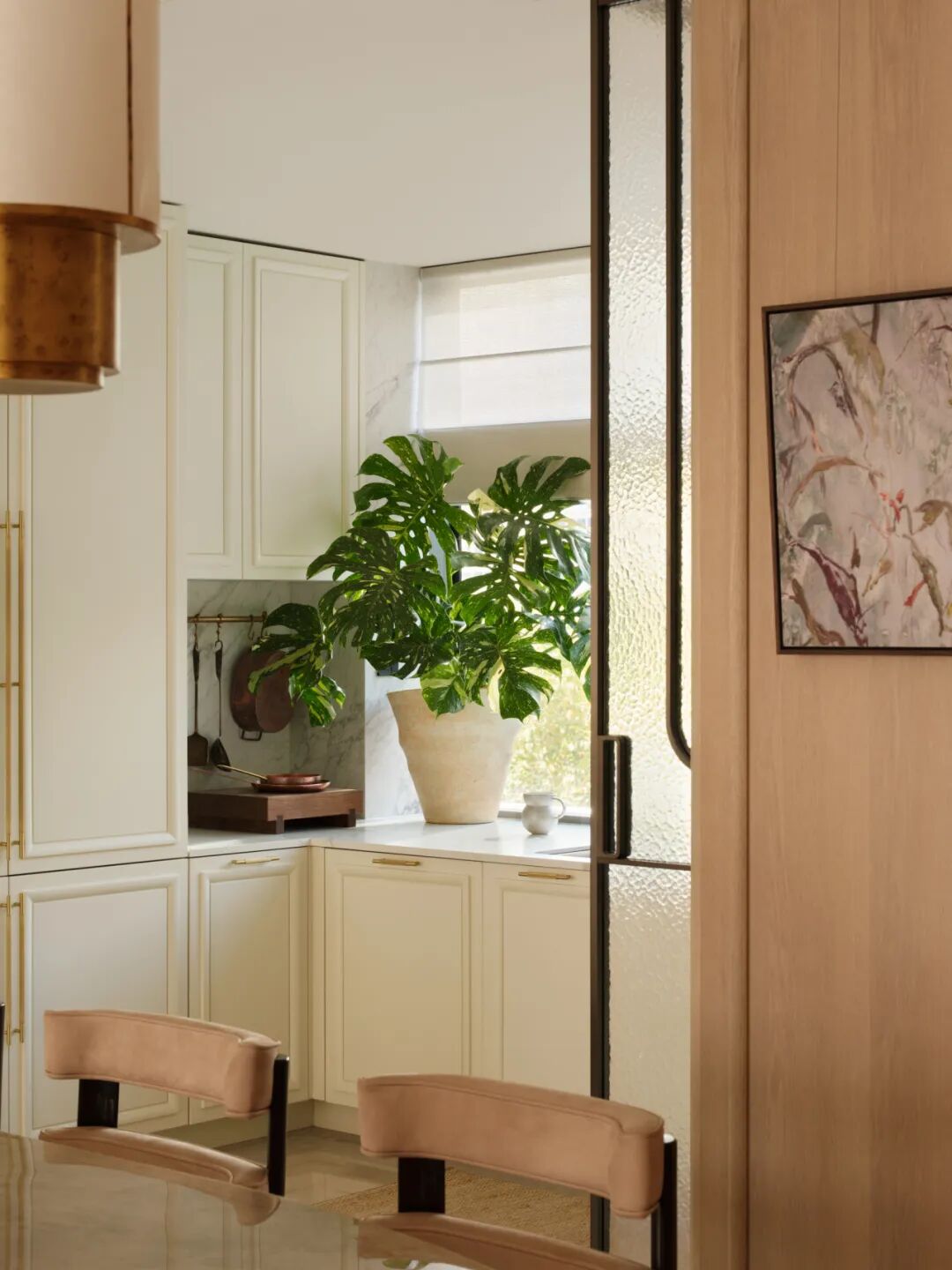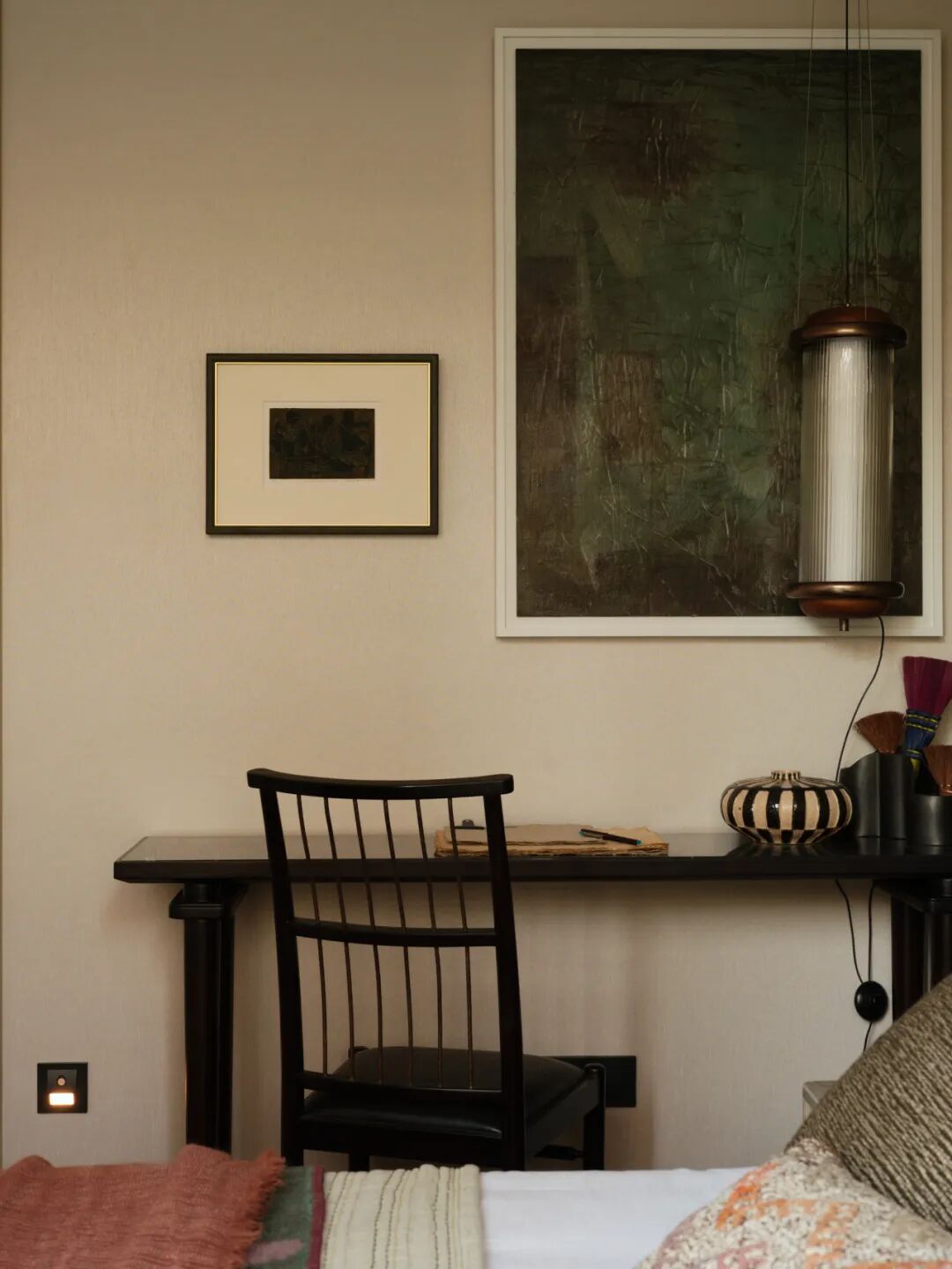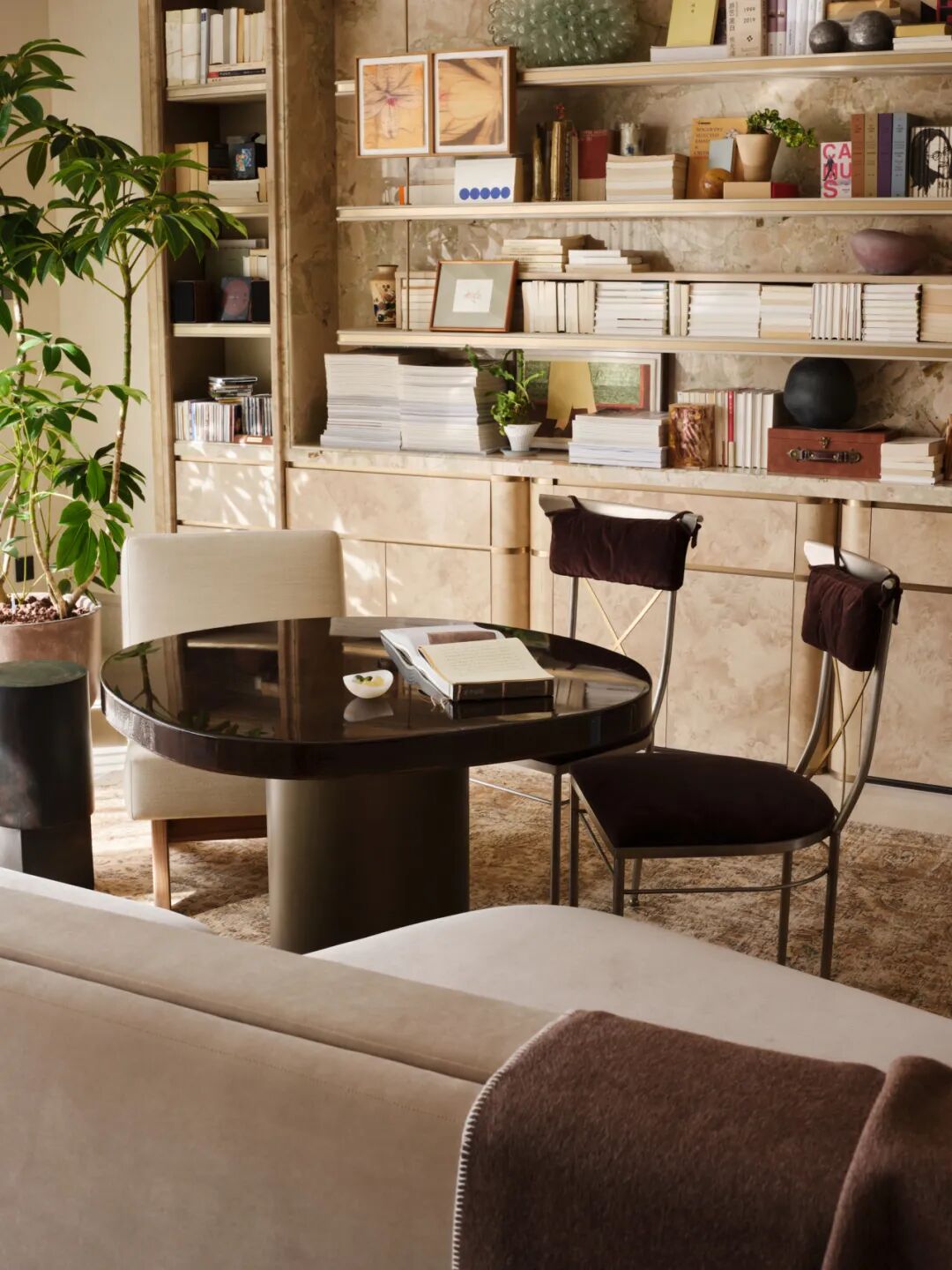 沙发背面,整面通高书架构建出阅读区,圆桌与座椅的组合形成轻办公、品茗的私密角落。陈列区摆放的叙利亚SALAHEDDIN葡萄灯,手工吹制的玻璃珠带着自然的气泡与裂纹,光线透过时温润柔和,营造出光影隐奢的氛围。这些单品不以风格自居,亦不标榜任何文化符号,而是在形态与质地的秩序中,与空间和居住者形成无声的共鸣——这正是“共相”的体现:跨越地域与文化的美学共识。