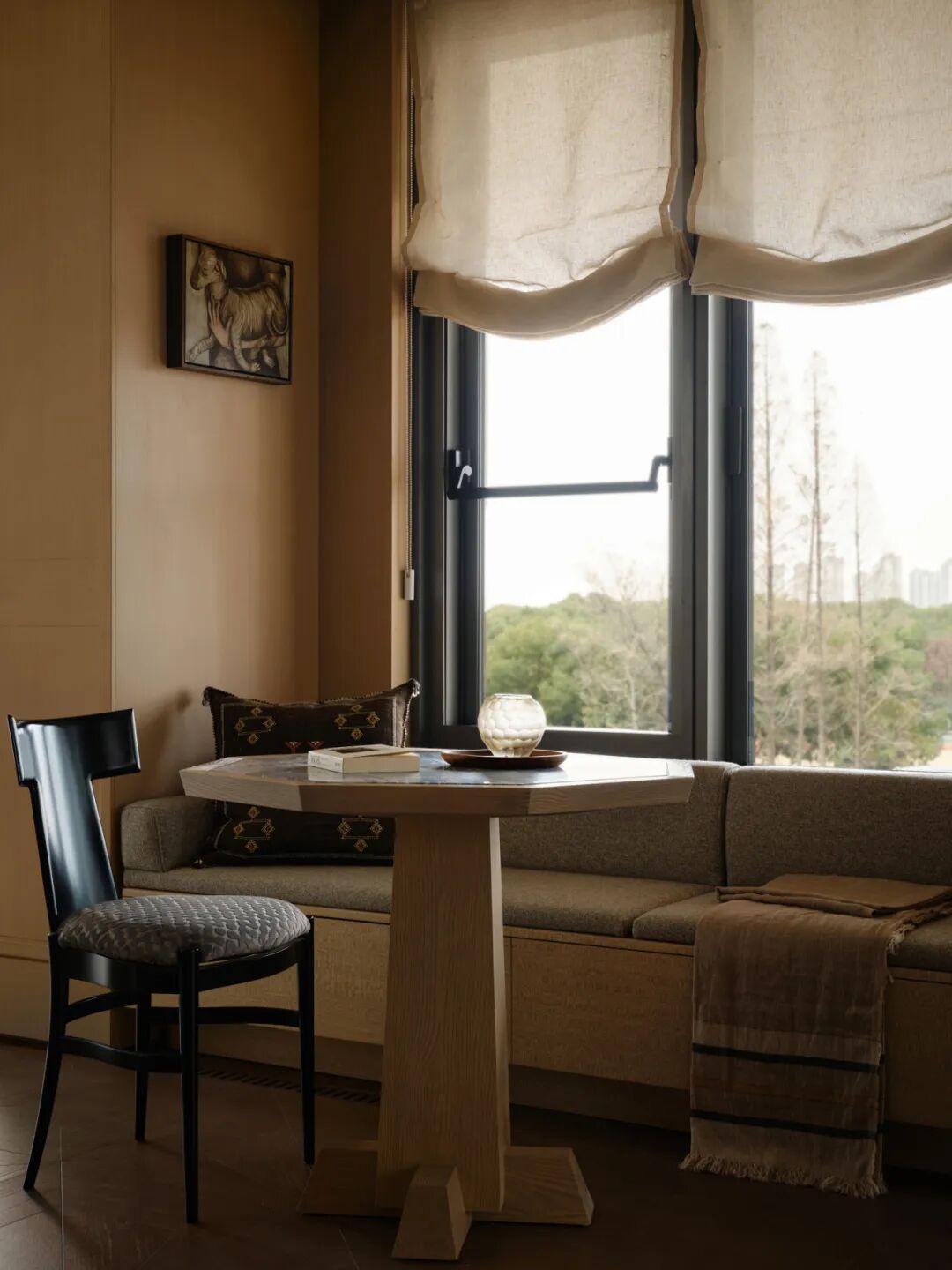 主卧阳台设置围合式卡座与绿植花箱,使室内外形成连续界面。自然不再作为远景存在,而成为日常体验的一部分。该空间兼具园艺空间与休闲功能,无论是侍弄花草,还是下午茶、阅读小憩,都能在此感受自然的浸润。