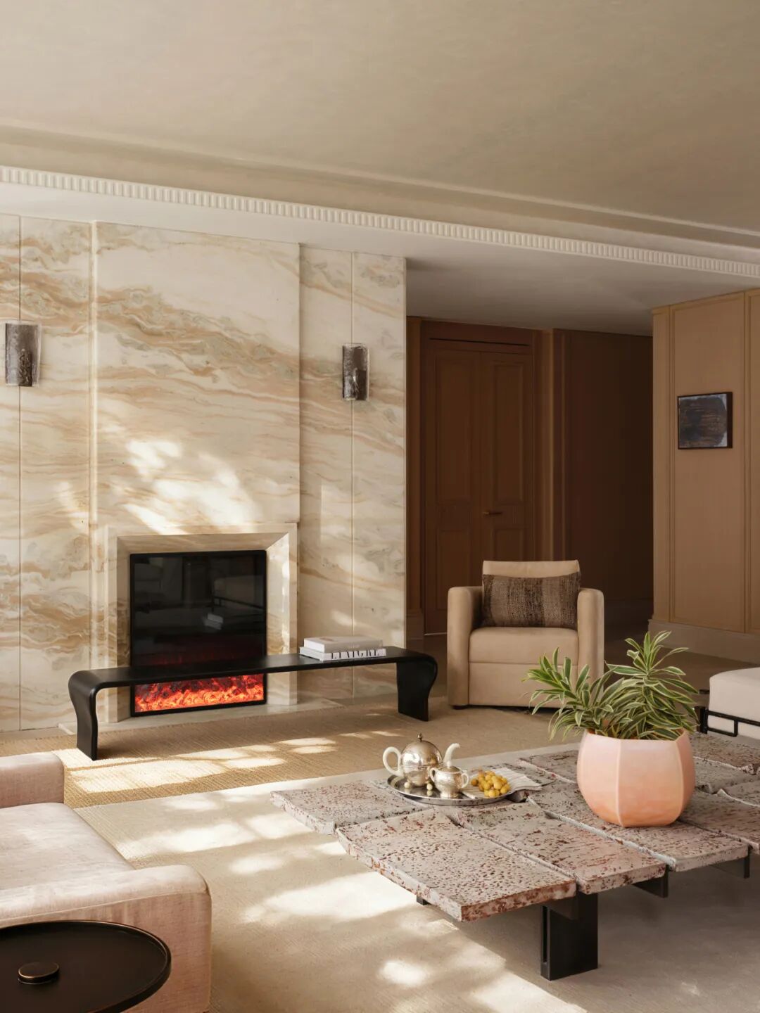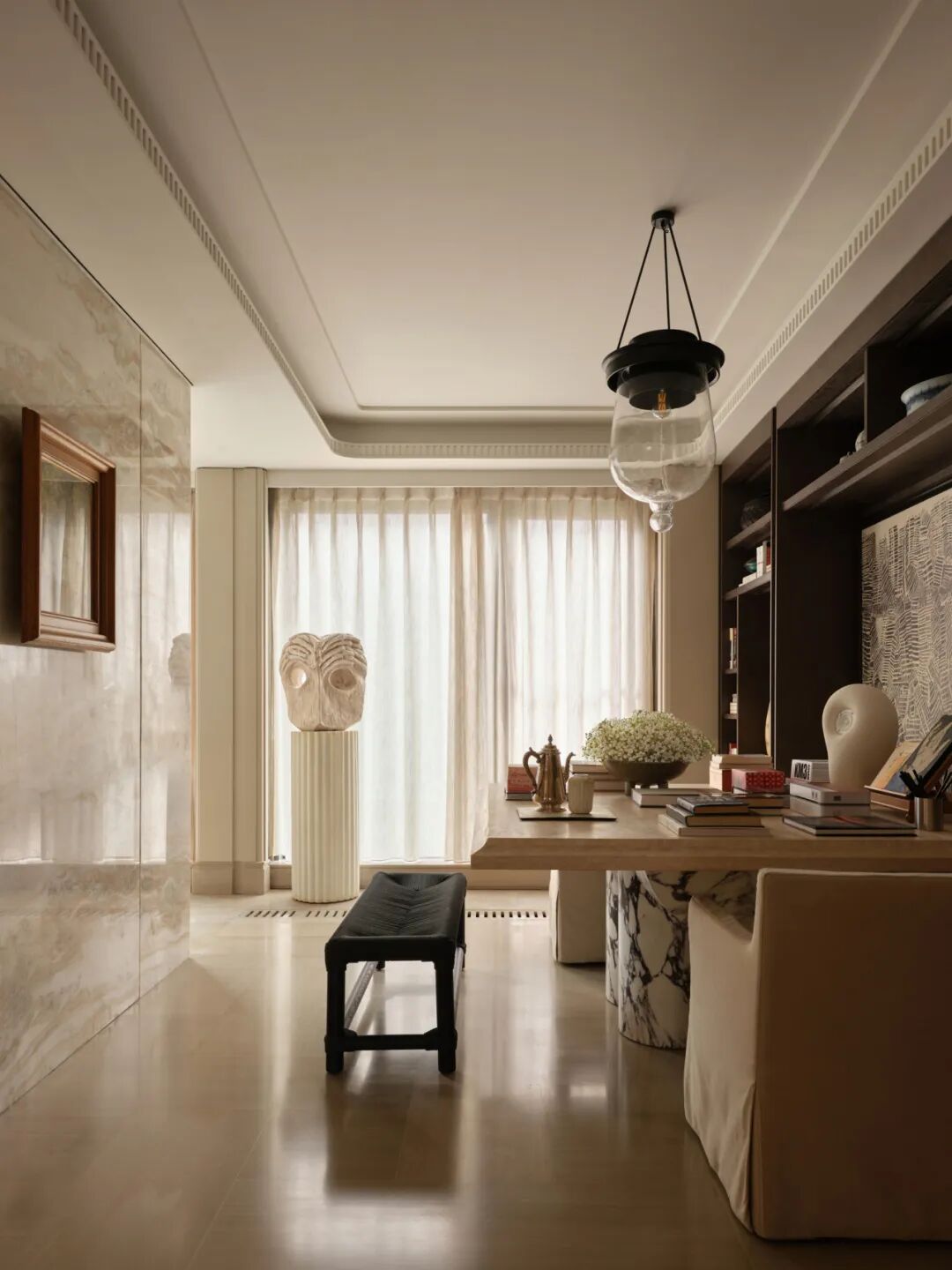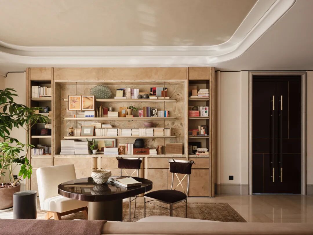 壁炉旁以围合式的休闲椅与长几打造出品茗、赏藏、闲谈的静谧角落——那是家中最具温度的所在,是冬日里最令人向往的一隅。半开放式书房成为客厅主社交区的精神延伸。